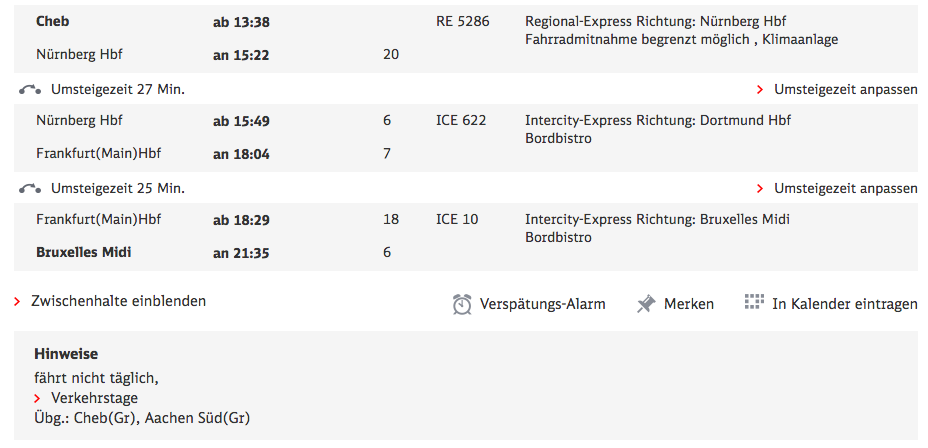 There is a similar, if slightly less useful, trick to get cheap tickets from Berlin to the Ruhrgebiet and Köln by starting your trip at Děčín hl.n. and routing via Berlin Hbf, but this does not work as far as Belgium – you have to end your trip in Germany. But here too I found Děčín – Berlin – Köln to be 50% less than Berlin – Köln for the same trains, booking a month ahead.