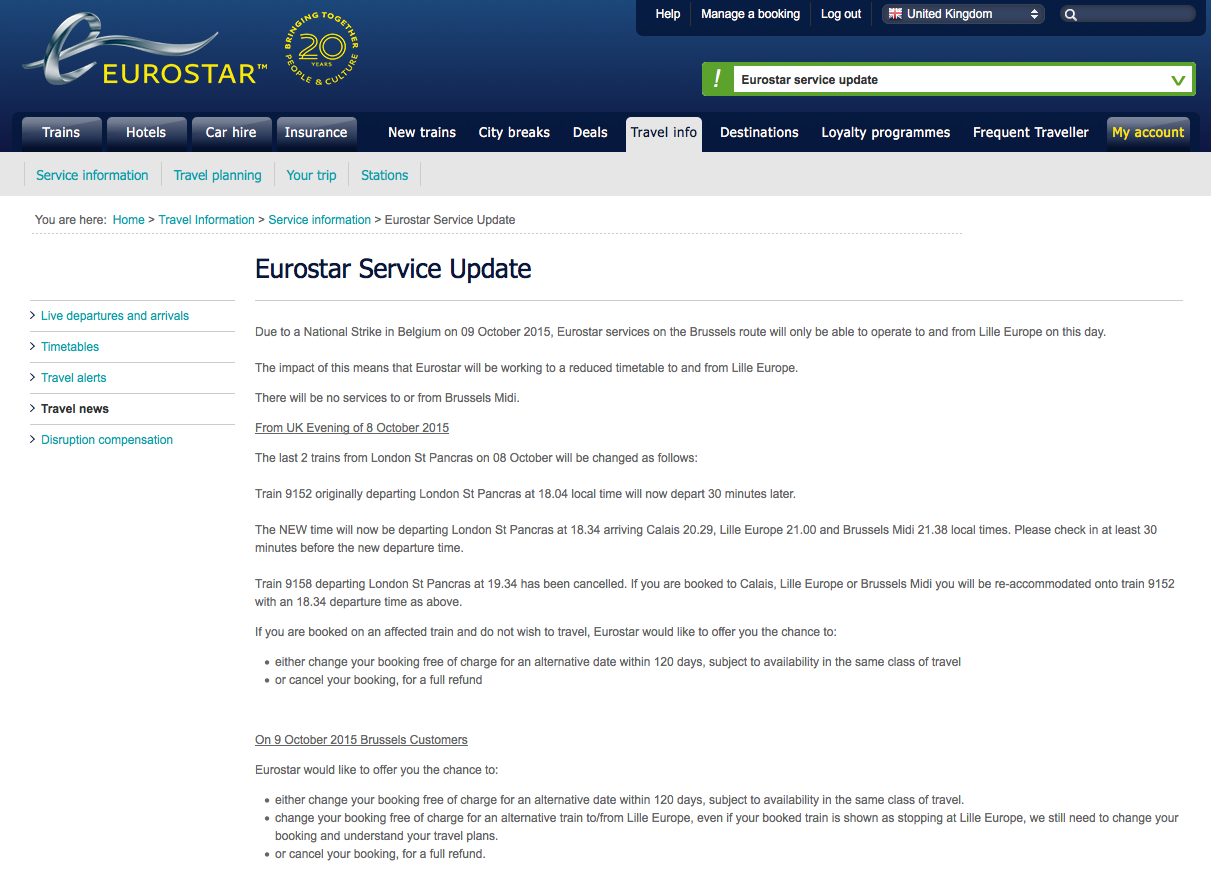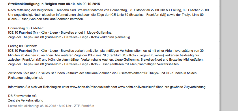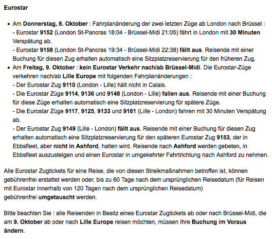 Later this week - on Thursday 8th October - I am due to travel from Berlin to Brussels. Then, booked on the same ticket, I travel onwards to London on Friday 9th October. Unfortuntately on 9th October there is a complete rail strike in Belgium - as explained in depth by both Eurostar (whose train I'm taking to London - screenshot of their info here), and Belgian railways SNCB (screenshot here).