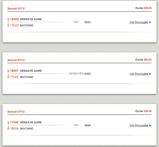 The SNCF staff at Bayonne of course just stood there, even after I suggested to one that he should help unload the bags from the bus. I some of it instead. I then complained to another member of staff that the arrangements were inadequate, and that there should be more buses, and one at least 30 minutes earlier. “Mais le weekend il n’y a plus de trains que ça!” Well, no, actually, that’s a lie, SNCF man. Here are the trains for next Saturday – there is at least a 1627 departure from Hendaye, and that was not covered by a bus. The clear message here: just don’t even try to go this way by train at a weekend, even if the trains work… And this is one of two routes in and out of Spain. I despair.