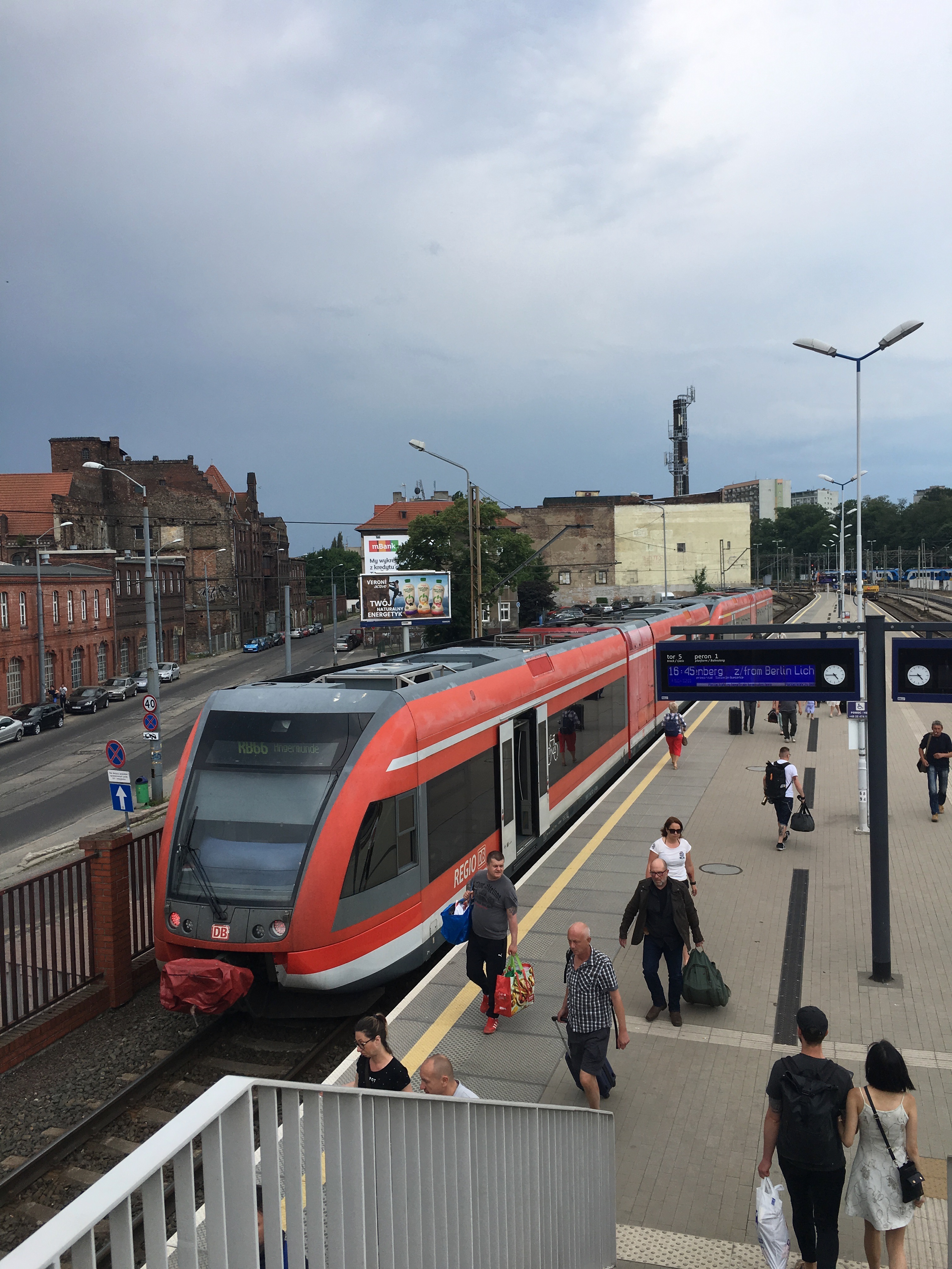Half the route between these two major European cities is single track and is not electrified. A handful of direct trains ply the route each day - just small diesel multiple units. Otherwise you have to change in Angermünde. The trip takes two hours because the infrastructure is so decrepit. Driving is quicker.