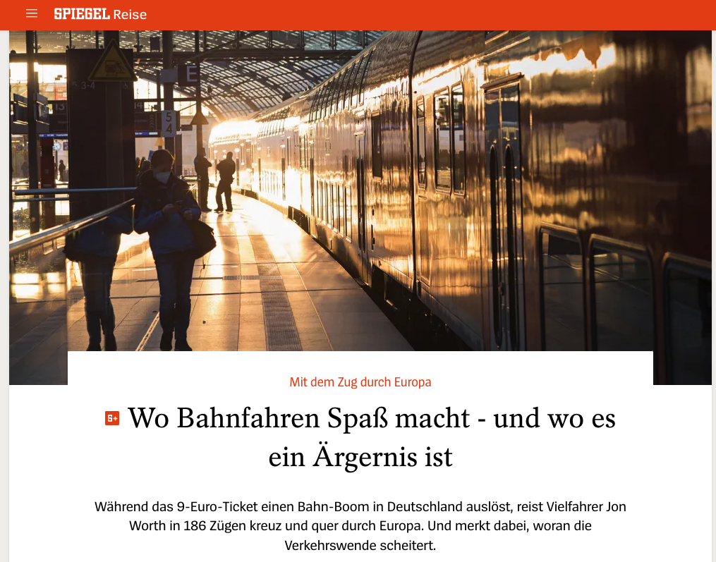 "Während das 9-Euro-Ticket einen Bahn-Boom in Deutschland auslöst, reist Vielfahrer Jon Worth in 186 Zügen kreuz und quer durch Europa. Und merkt dabei, woran die Verkehrswende scheitert."
