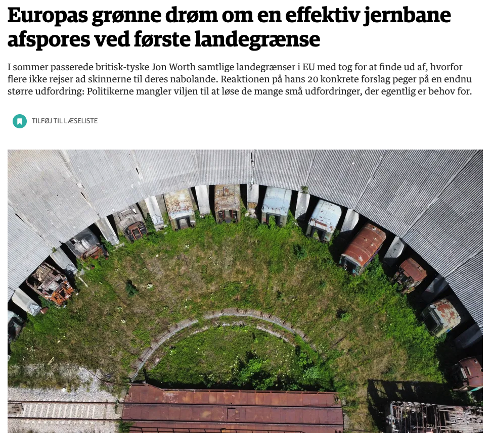 I sommer passerede britisk-tyske Jon Worth samtlige landegrænser i EU med tog for at finde ud af, hvorfor flere ikke rejser ad skinnerne til deres nabolande. Reaktionen på hans 20 konkrete forslag peger på en endnu større udfordring: Politikerne mangler viljen til at løse de mange små udfordringer, der egentlig er behov for.