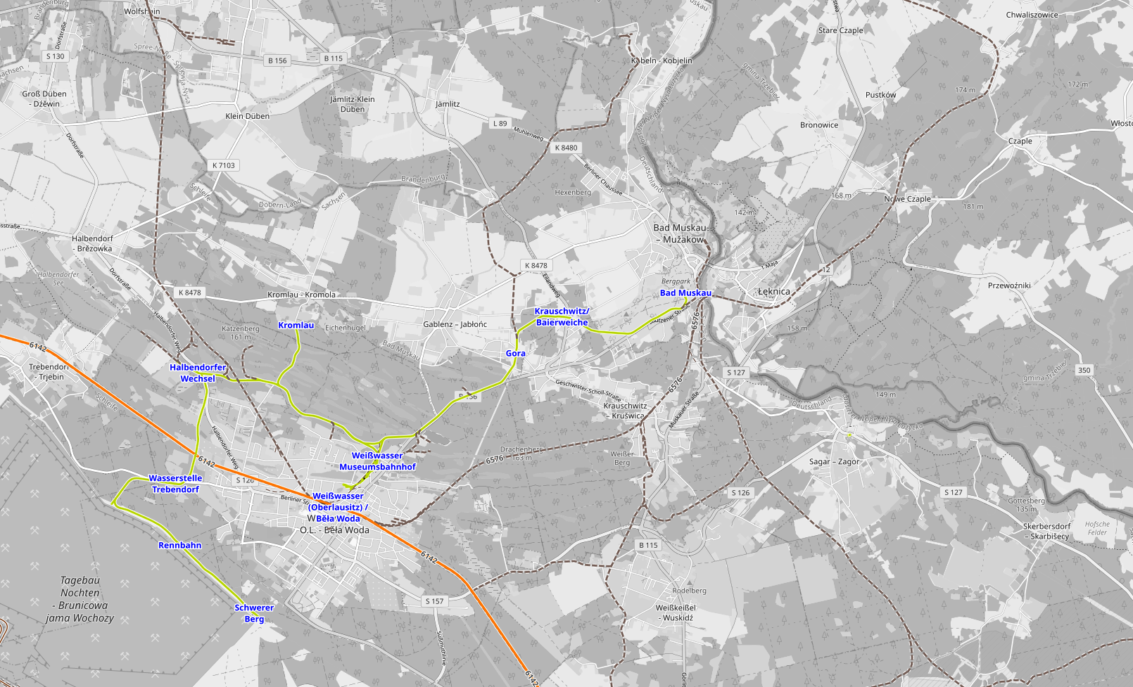 An active railway line to Weißwasser (orange), the narrow gauge Waldeisenbahn Muskau (green), and the abandoned lines into Poland to Łęknica (dotted brown). And given that the Neiße River is the border Germany-Poland since 1945 there must be a former railway bridge there too. Some quick searches about Bad Muskau led me to Fürst-Pückler-Park which looked like it was worth a visit, not least as the grounds of the castle cross over to Poland.