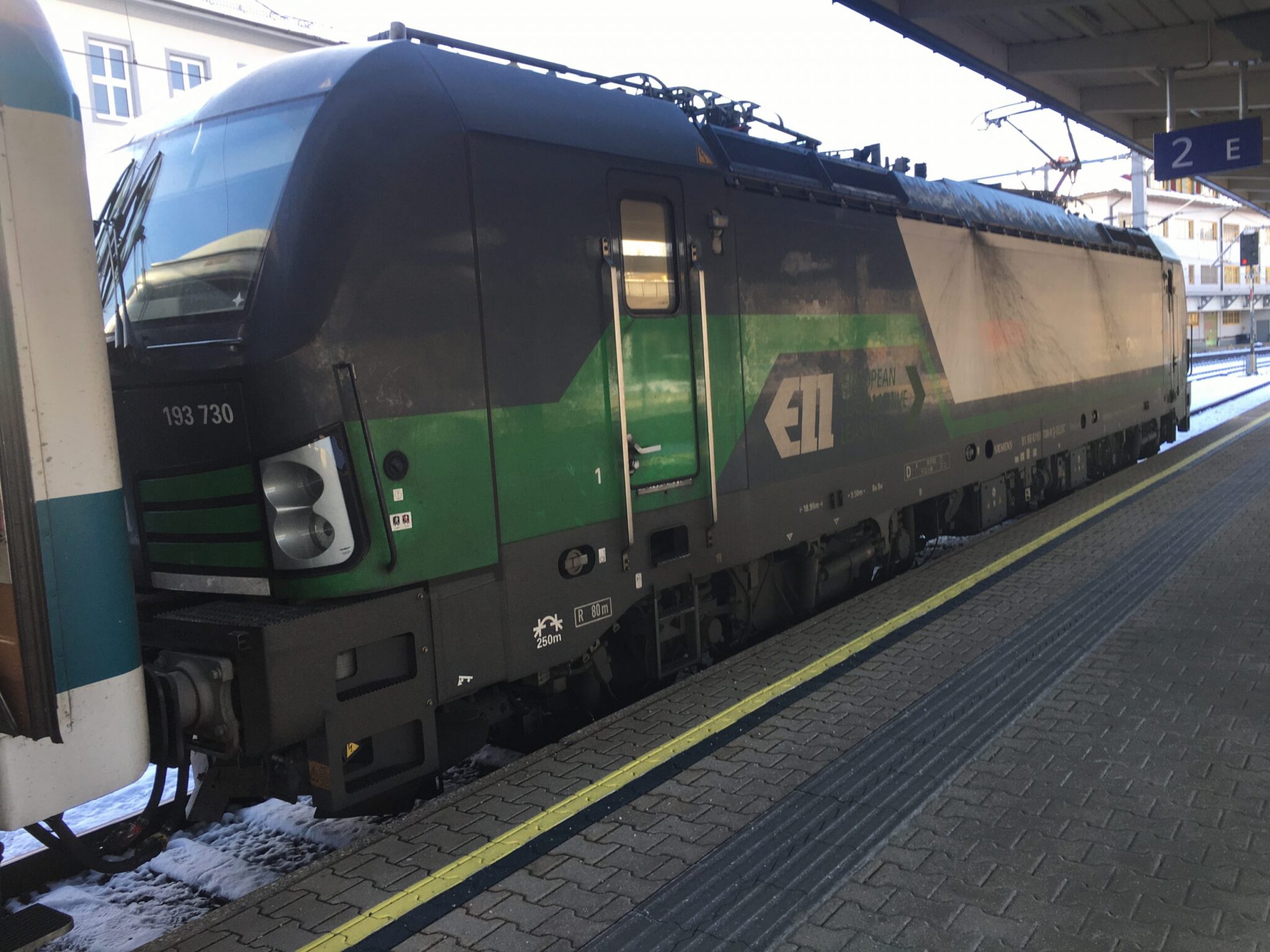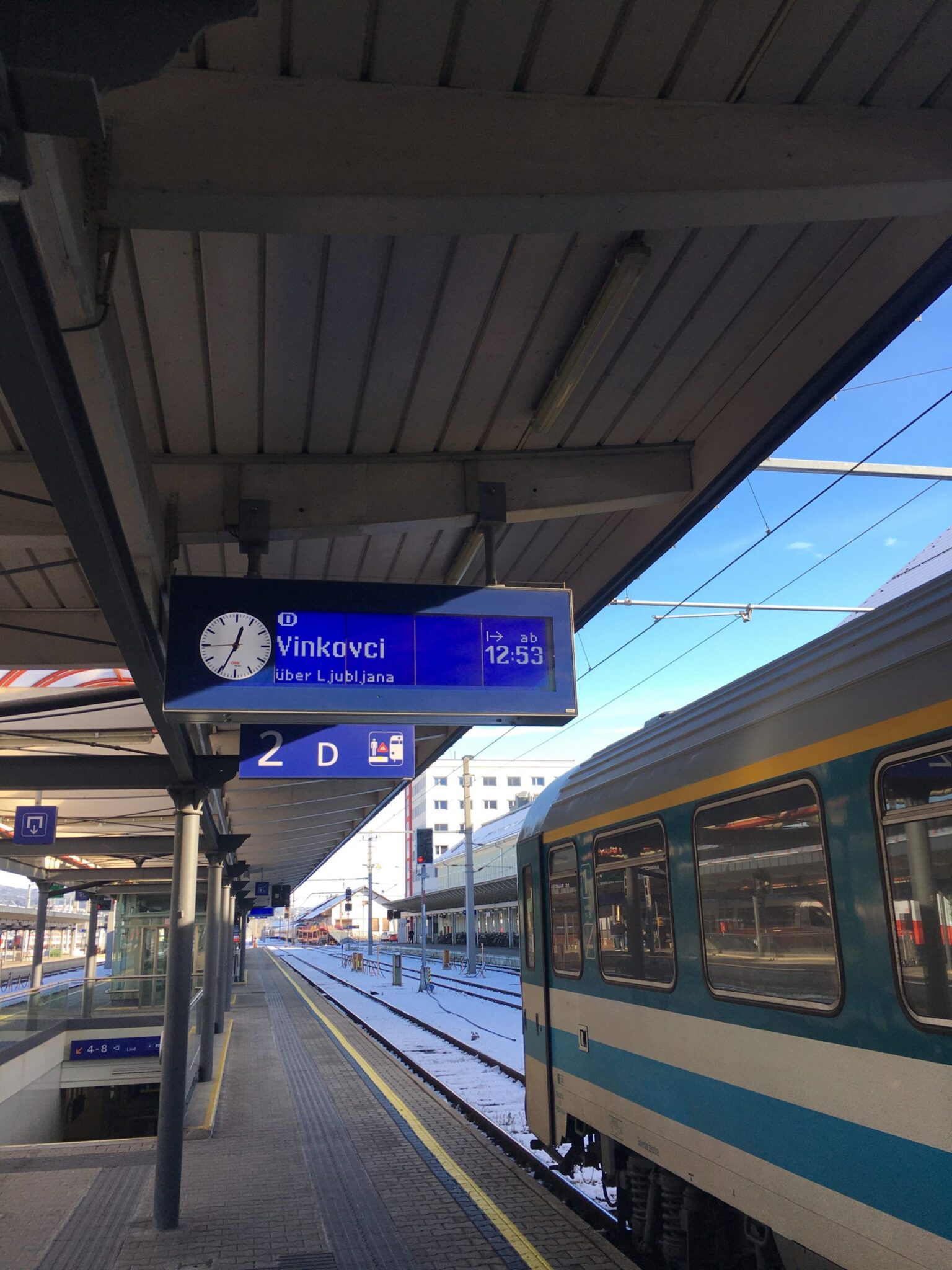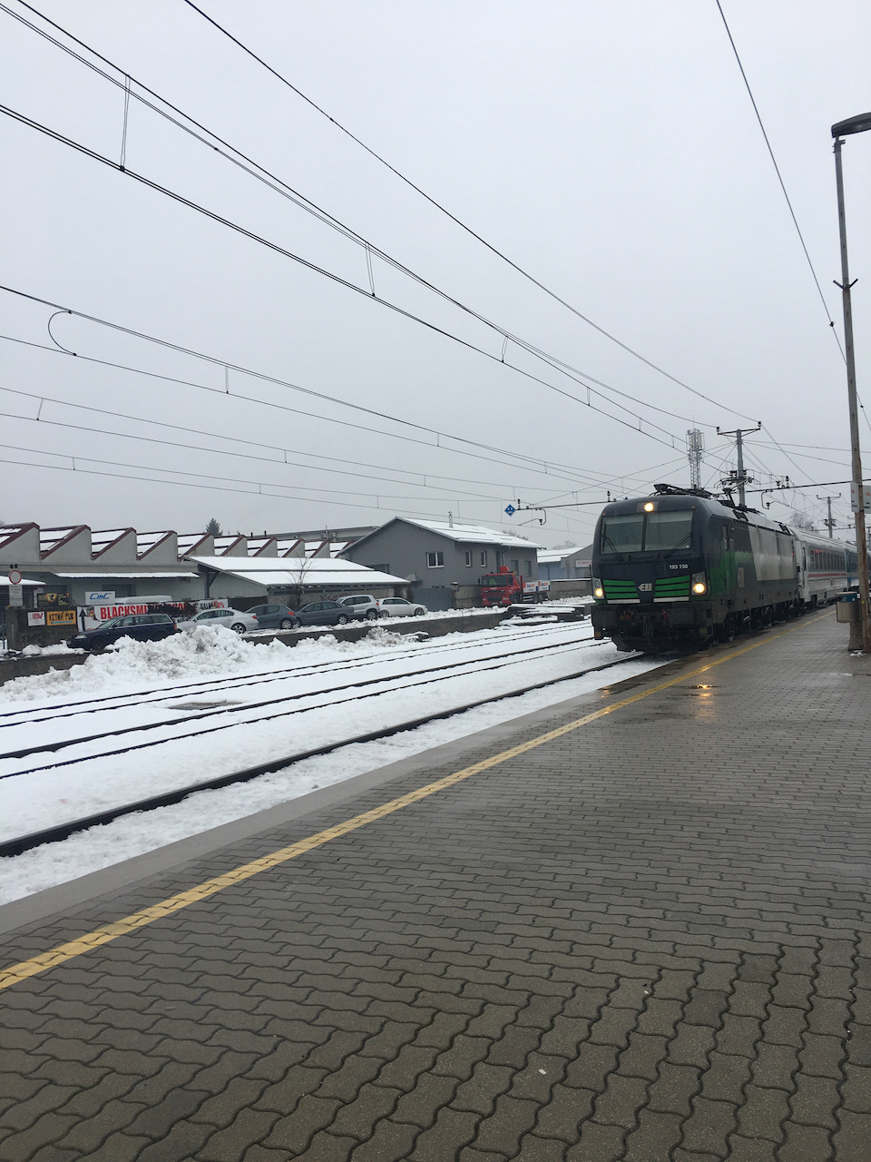 This one is a trip back to the 1970s! Normally this would be composed of 5 carriages, the day I took it there were just 3 - two of them very retro Slovenian Railways with opening windows, and one more modern air conditioned one, today hauled by a leased modern Siemens Vectron locomotive. The trip on the day I took it was picture perfect - bright winter sun and fresh snow. Even without the snow this is a charming route - the pace is leisurely as the train winds along the hills and through small villages. The train has no catering, and continues via Ljubljana and Zagreb to Vinkovci that is on the border of Croatia and Serbia, towards Belgrade.