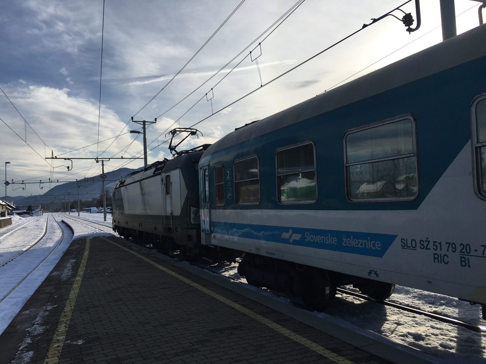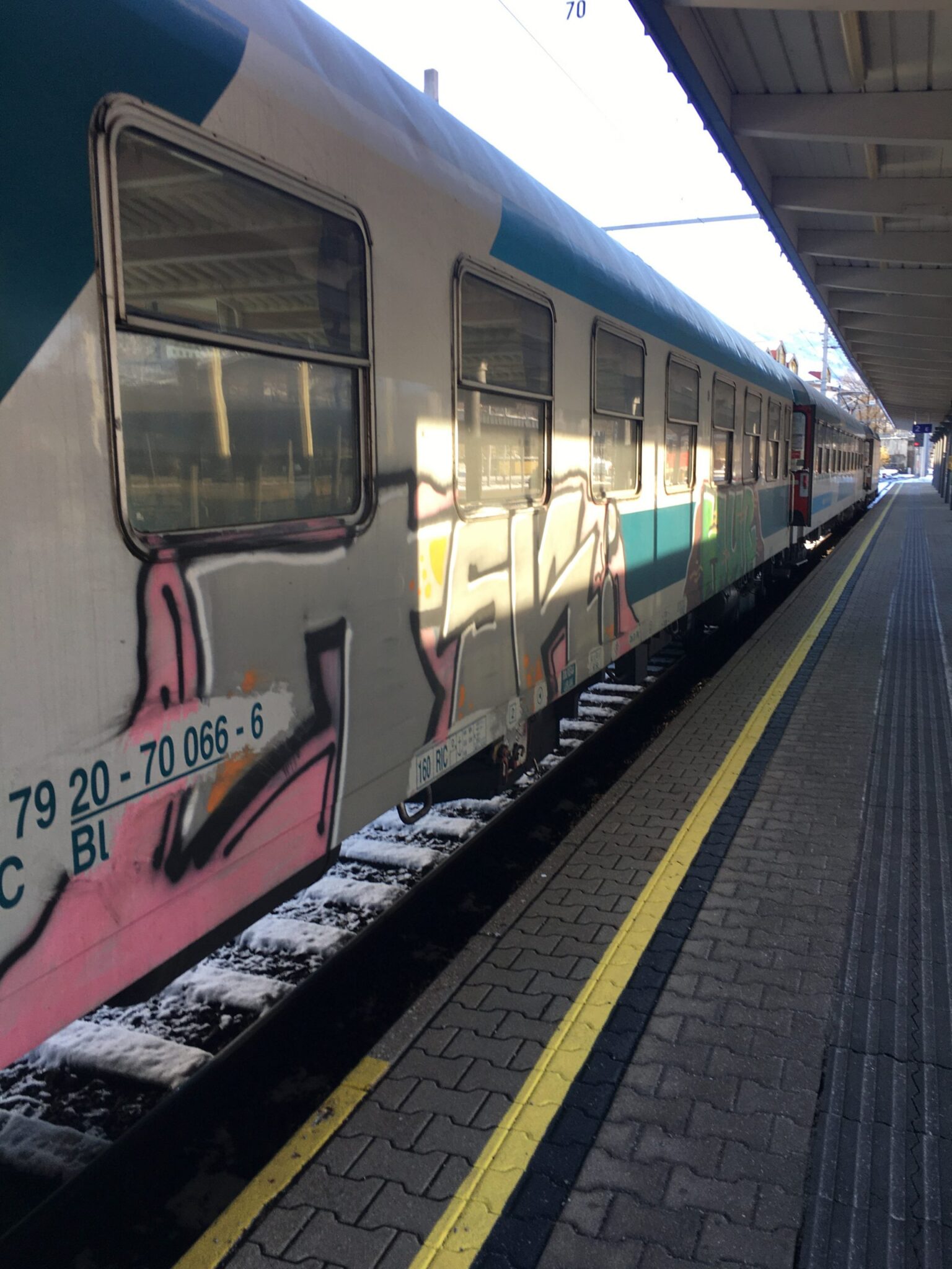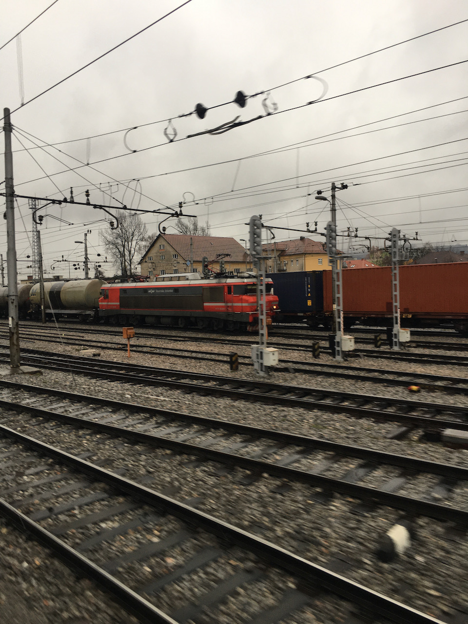 This one is a trip back to the 1970s! Normally this would be composed of 5 carriages, the day I took it there were just 3 - two of them very retro Slovenian Railways with opening windows, and one more modern air conditioned one, today hauled by a leased modern Siemens Vectron locomotive. The trip on the day I took it was picture perfect - bright winter sun and fresh snow. Even without the snow this is a charming route - the pace is leisurely as the train winds along the hills and through small villages. The train has no catering, and continues via Ljubljana and Zagreb to Vinkovci that is on the border of Croatia and Serbia, towards Belgrade.