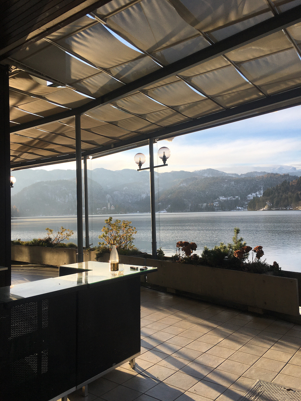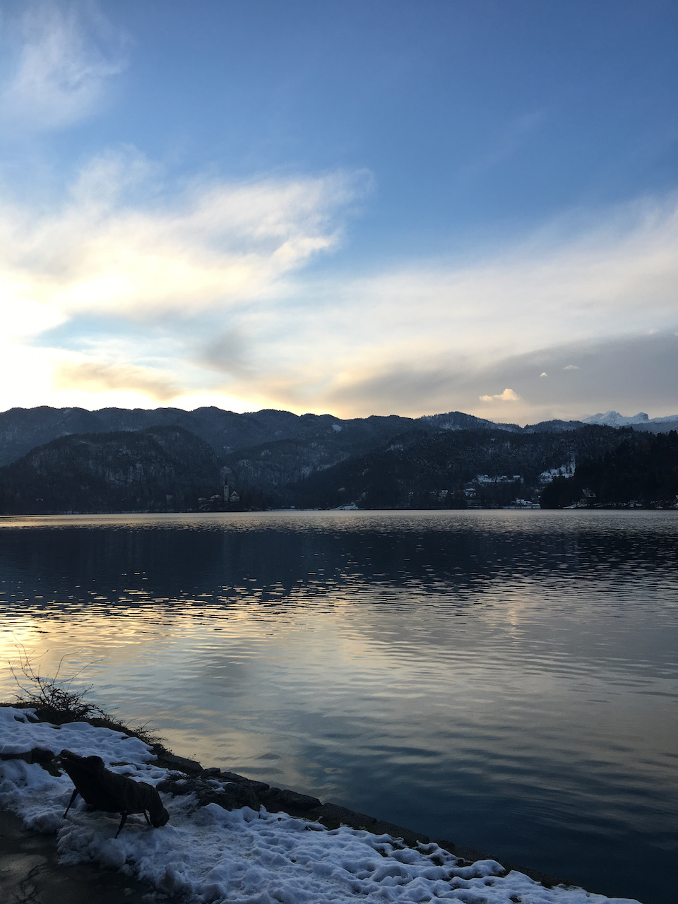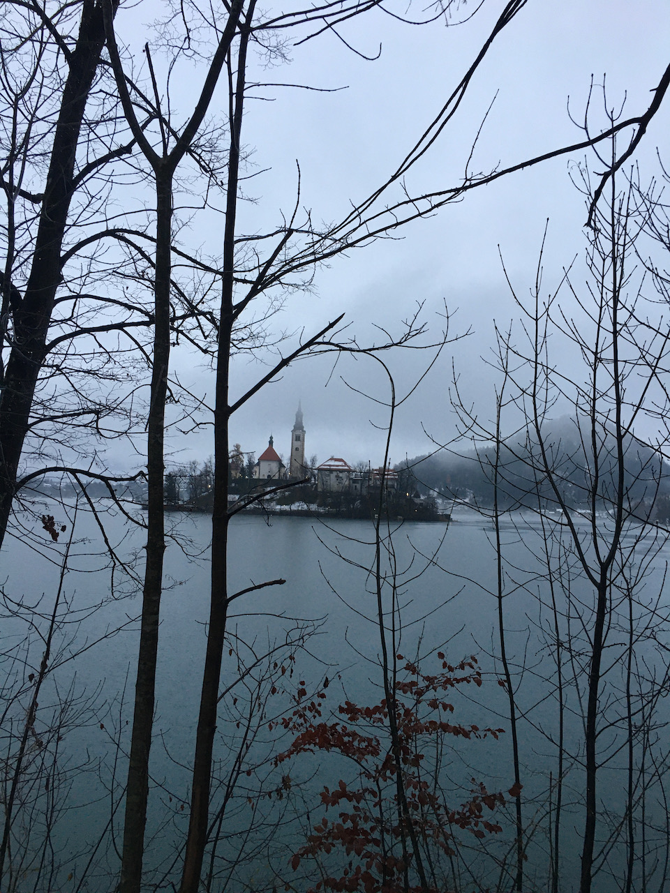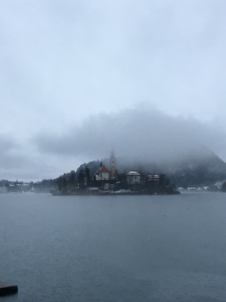 Bled is charming - there is a small church on an island in the lake, and the high peaks of the Triglav National Park rise on the other side of the lake. Do go! The snow turned to rain, but that made for some atmospheric pictures on a cycle around the lake!