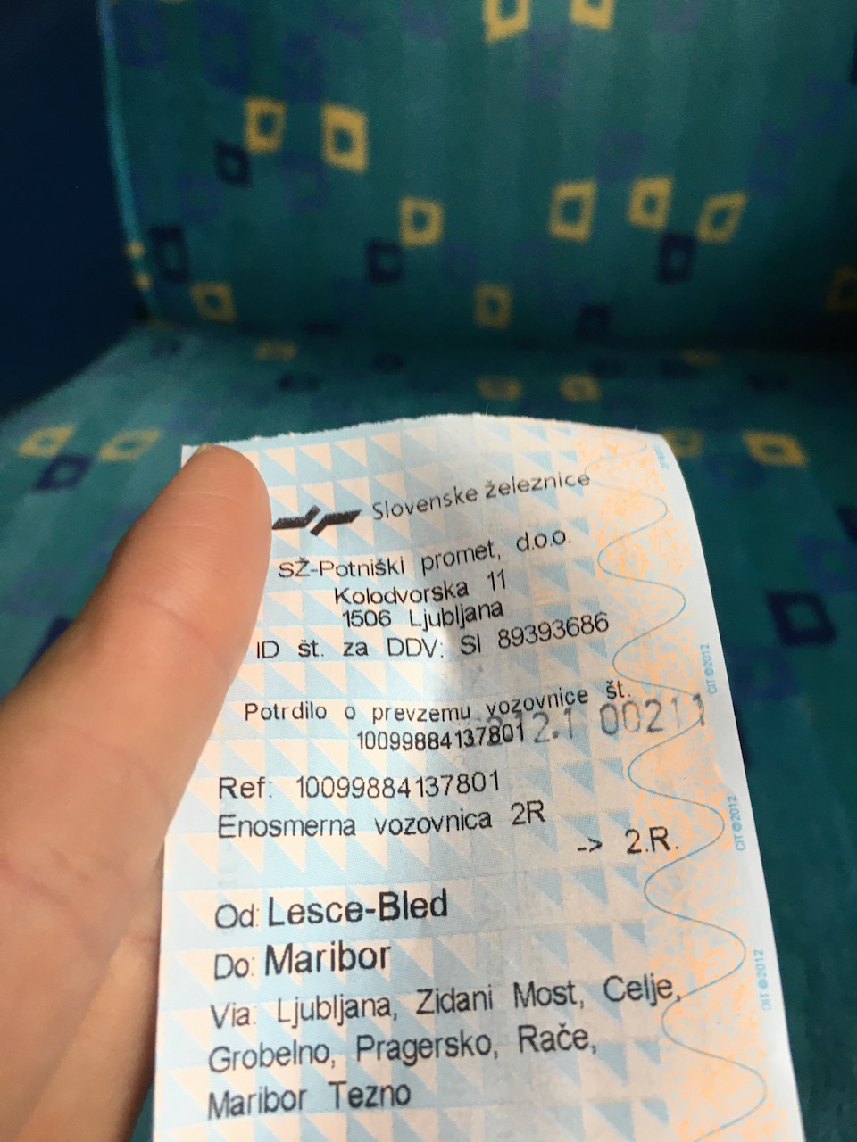 Train 4D 211 - Lesce-Bled - Zidani Most - D. 13:51, A. 15:41 Booked online on the SŽ website - ticket from Lesce-Bled all the way to Maribor (see Train 5 below) for €13,90 second class. The ticket is a PDF that you are asked to print, but I could not do at my B&B. So I showed this on my phone to the guard on the train who then printed a ticket with the same QR code on it, and stamped it. And then the guard in Train 5 tried to read the QR code from the paper that had been printed in Train 4! Not very efficient, but it worked.