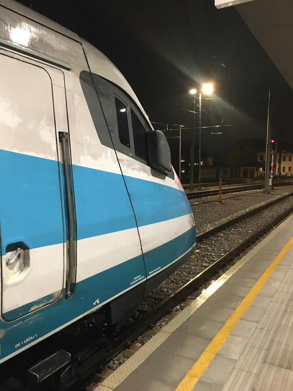 Due to the lockdown in Austria, and the late hour of arrival in Villach, I was literally the only passenger in my whole carriage for a good part of the trip! Slightly eerie. The train left München 15 minutes late (due to repairs on the track somewhere earlier) and caught up a little, arriving in Villach with 8 minutes of delay.