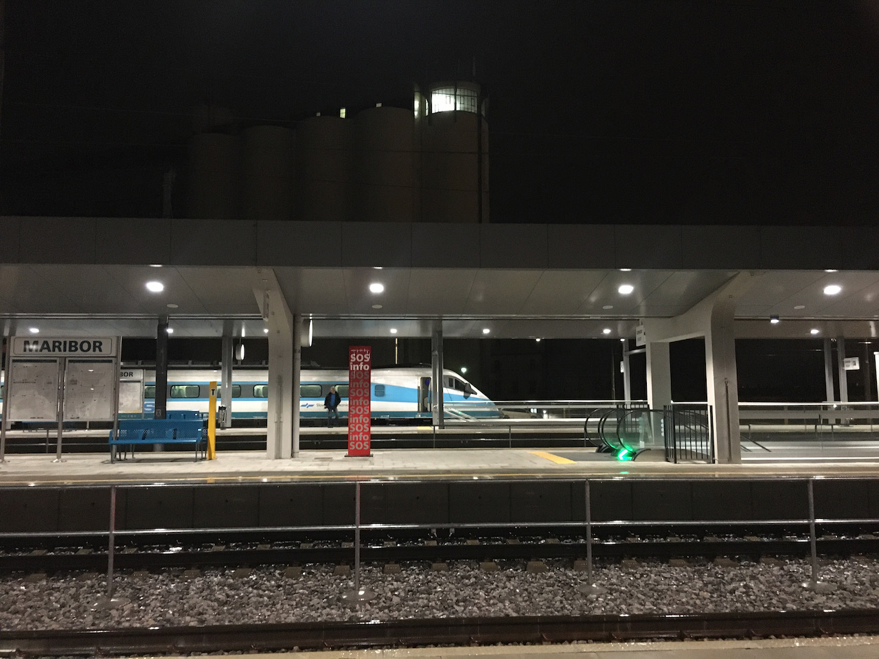 This part of the route is more varied than Ljubljana - Zidani Most (I've done it before in full daylight) - it passes small towns and villages and follows the path of some smaller rivers. It's interesting and scenic, and gives a view into life in Slovenia. Maribor station has been upgraded since I was last there, but it is a rather cold place, with stark and windswept platforms.