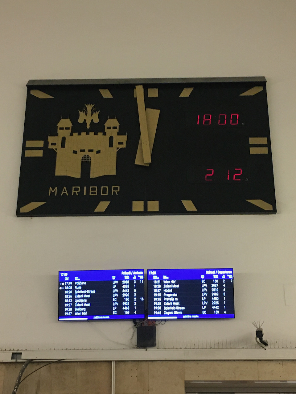 With an hour between my trains I'd have gone for a brief bike tour had the weather been OK - bus as it was driving rain I sought refuge in the bar at Maribor station instead. Then upon returning to the station hall my train was listed as to be departing 7 minutes late. In the end it departed 28 minutes late - and no accouncements were made about this either on screens on the platform or over loudspeakers. And it seems ÖBB cannot get live running information from Slovenia, as any notifications did not appear there either.