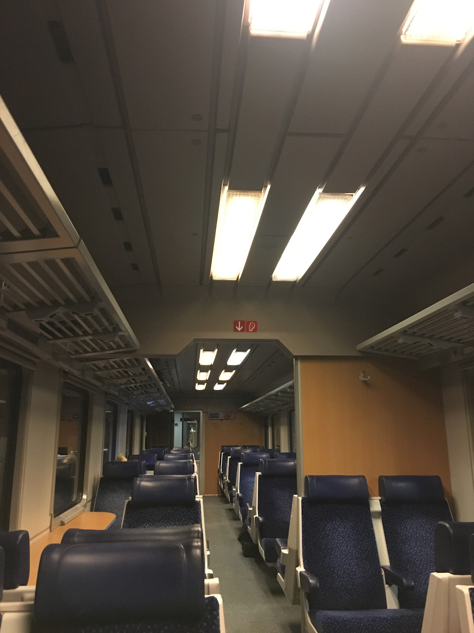 This was the München - Villach portion of the Frankfurt (Main) Hbf - Klagenfurt Hbf service. You can find all the details on the composition of the train on Vagonweb here - it is an old style locomotive-hauled EuroCity, with compartments in first class. The train had wifi, but this did not work well between München and Salzburg, and was generally better after that - probably dependent on the lousy quality of German mobile networks in rural areas! The train has a Bordbistro that serves a more limited range of food than the Bordrestaurant in the ICE.