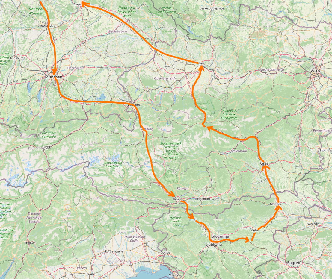 These are the main parts of the route in Southern Germany, Austria and Slovenia mapped