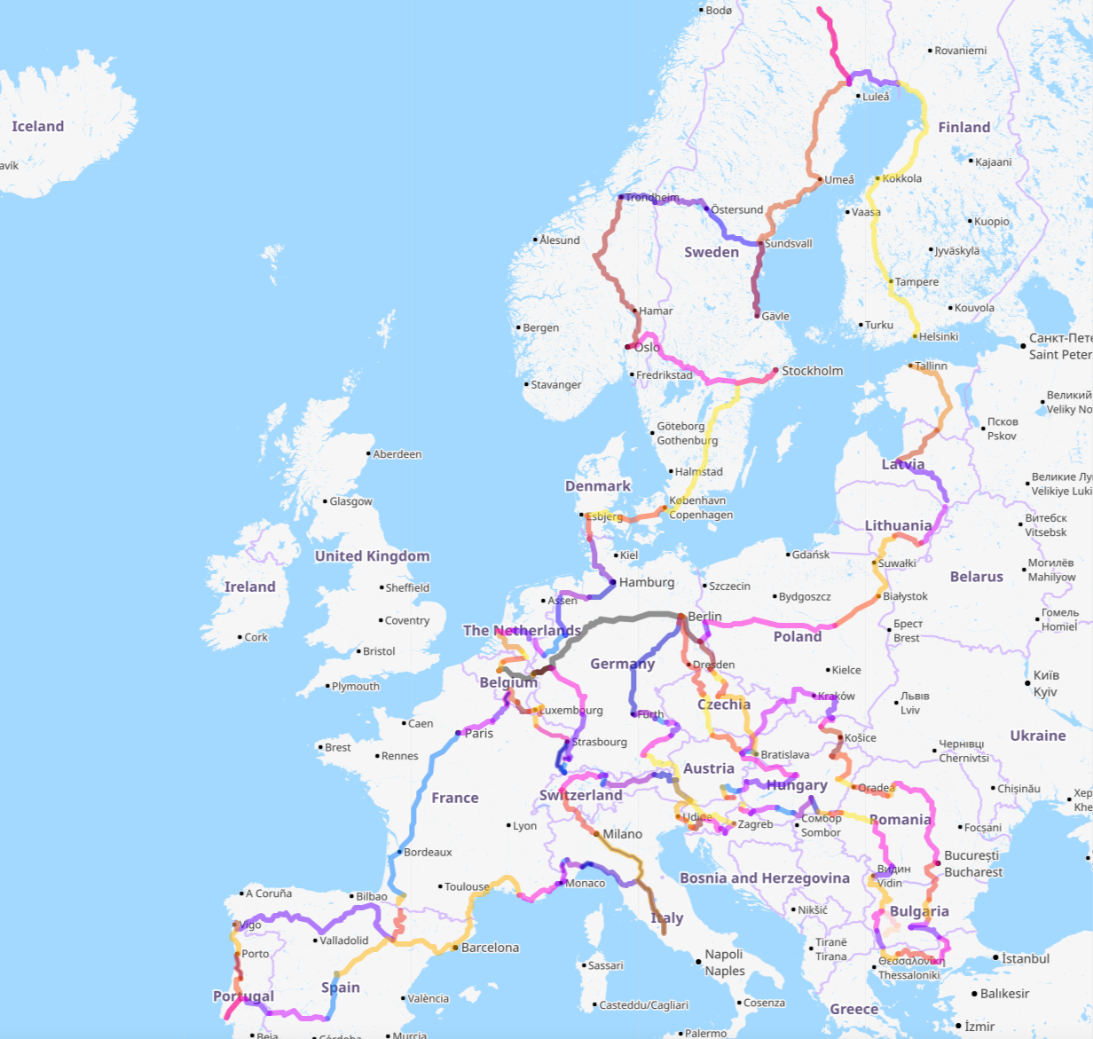 This is mapped using the OpenStreetMap umap tool, using data exports from Pierre Beyssac's rail routing tool.