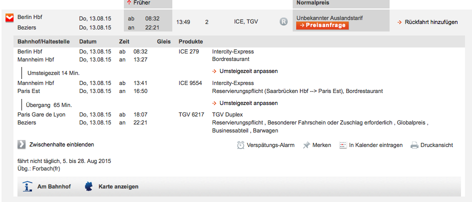 The thing is that – in my experience – this line is not actually completing that task very well at all. I am trying to plan a Berlin – (Mannheim) – Béziers rail trip this summer, and the only decent connection going southbound takes me via Paris Est along the LGV Est instead (details here).