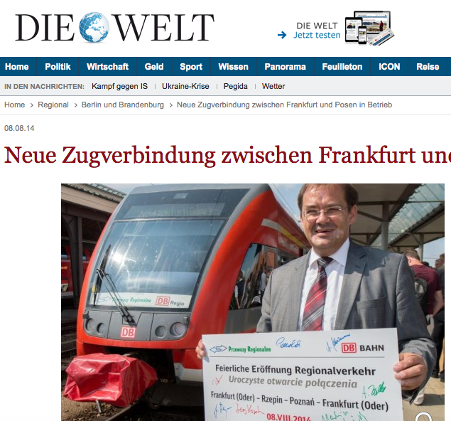 Mit Bedauern hat DB Regio Nordost die Entscheidung der PKP PR zur Kenntnis genommen, die erst im August 2014 eingeführte Verbindung zwischen Frankfurt (Oder) und Poznan zum 31. Dezember dieses Jahres einzustellen, da die Leistungen auf der polnischen Seite nicht finanziert sind.