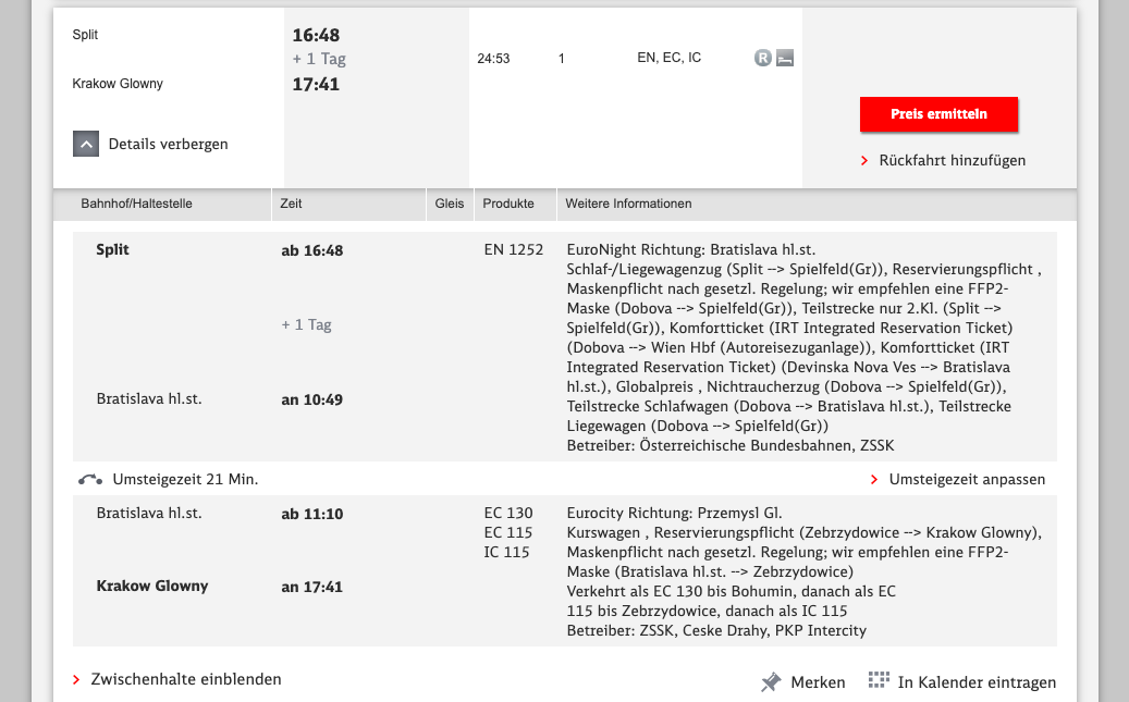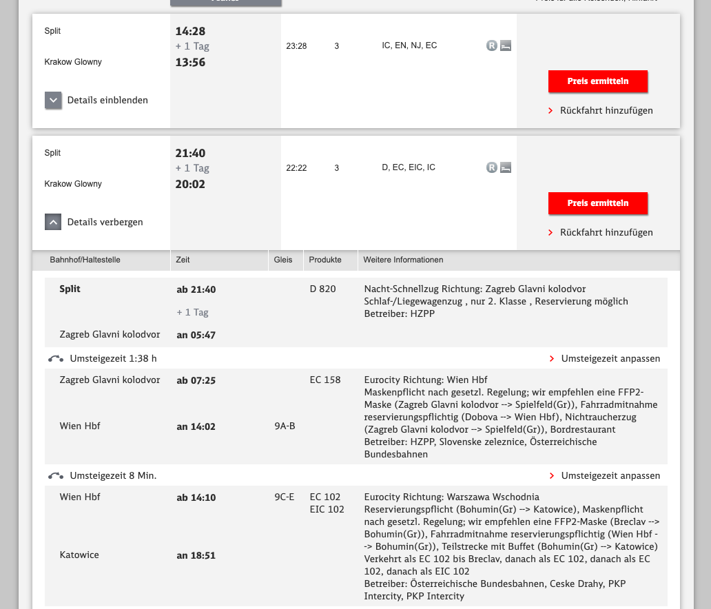 Anyway, to the timetable searches. DB gives me just 1 of the night trains - the HŽPP Split - Zagreb service, D. 21:40 (the earlier connection is an InterCity to Zagreb, then a EuroNight from there):