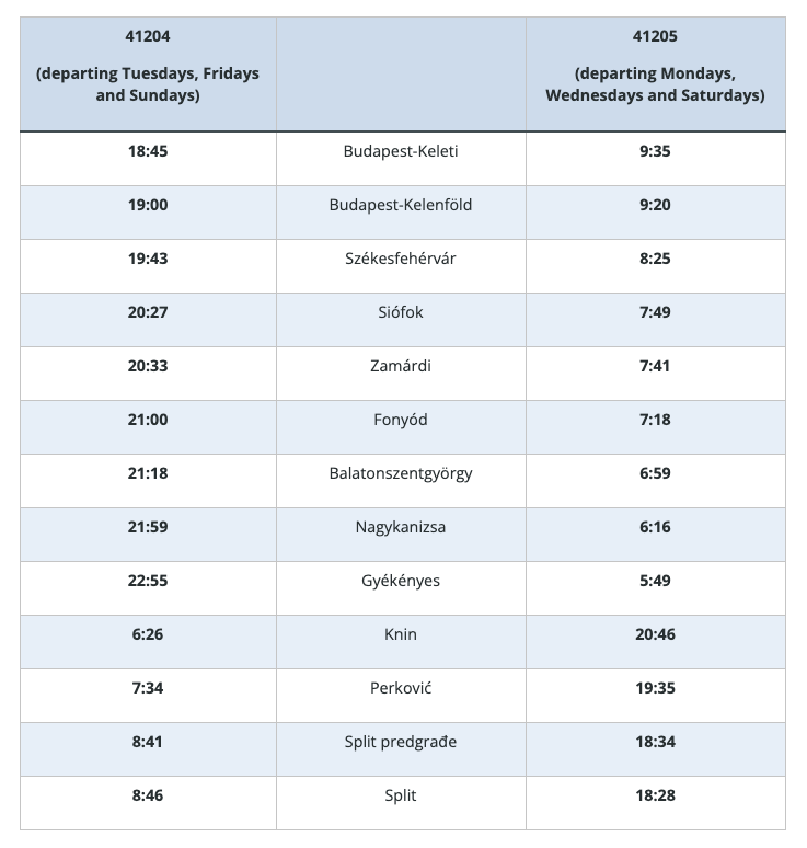 The timetable for the MÁV Budapest - Split service is on MÁV's website - it runs Mondays, Wednesdays and Saturdays: