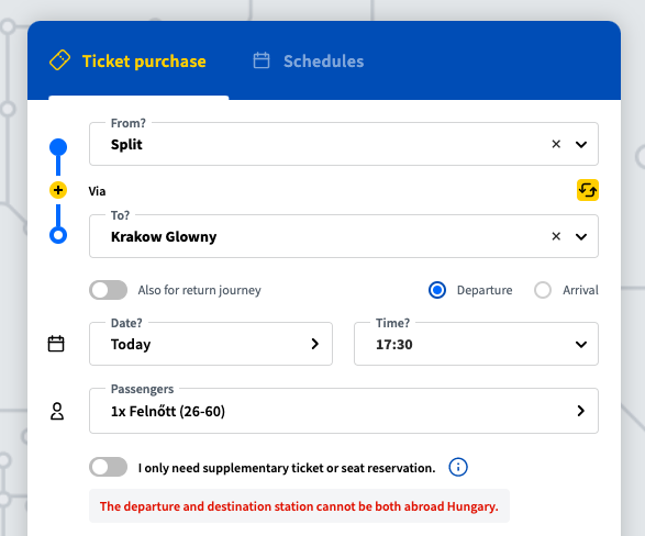 But if you put Split and Kraków into MÁV's timetable search, it gives you an error... either the start or the end of a trip must be in Hungary: