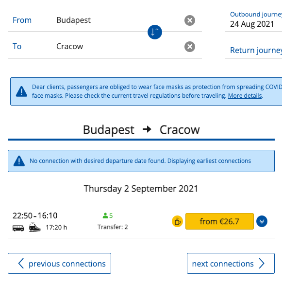 RegioJet doesn't offer me a connection to Kraków though, as RegioJet does not run there - this is the best it can do - with buses, and a week late!