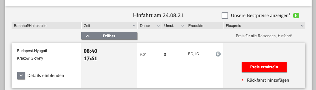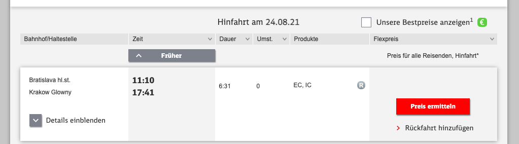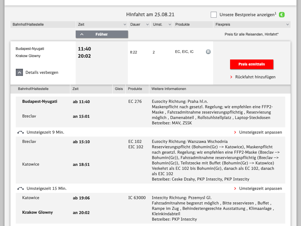 Search for Wednesday 25 August and there it is - with a neat change in Bratislava for Kraków:
