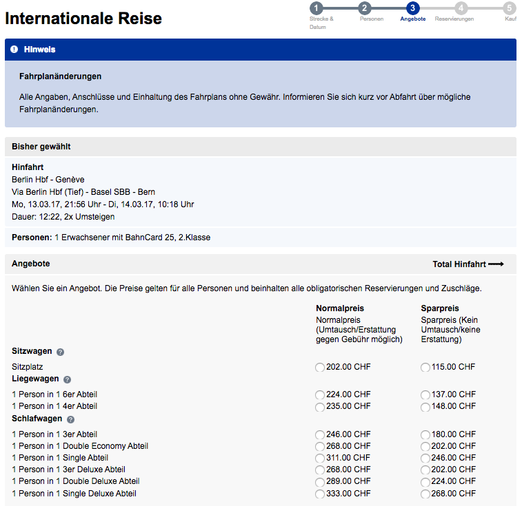Instead put Berlin to Basel SBB in DB’s Reiseauskunft and you get a whole lot of better prices, although oddly not for Schlafwagen for some reason: