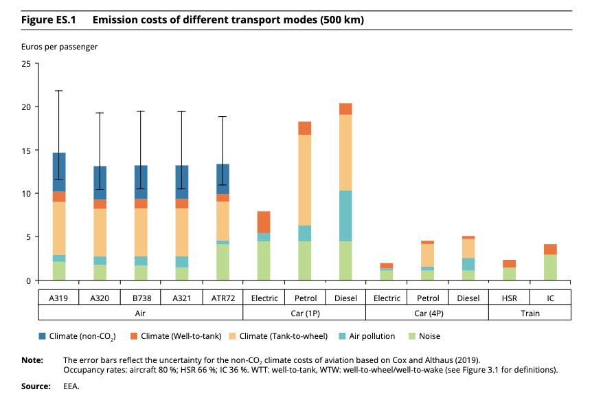 I might quibble with some of the numbers here, but the overall picture is obvious. Like for like, take the train over the plane. And indeed don't take the car if you are the only person in it.