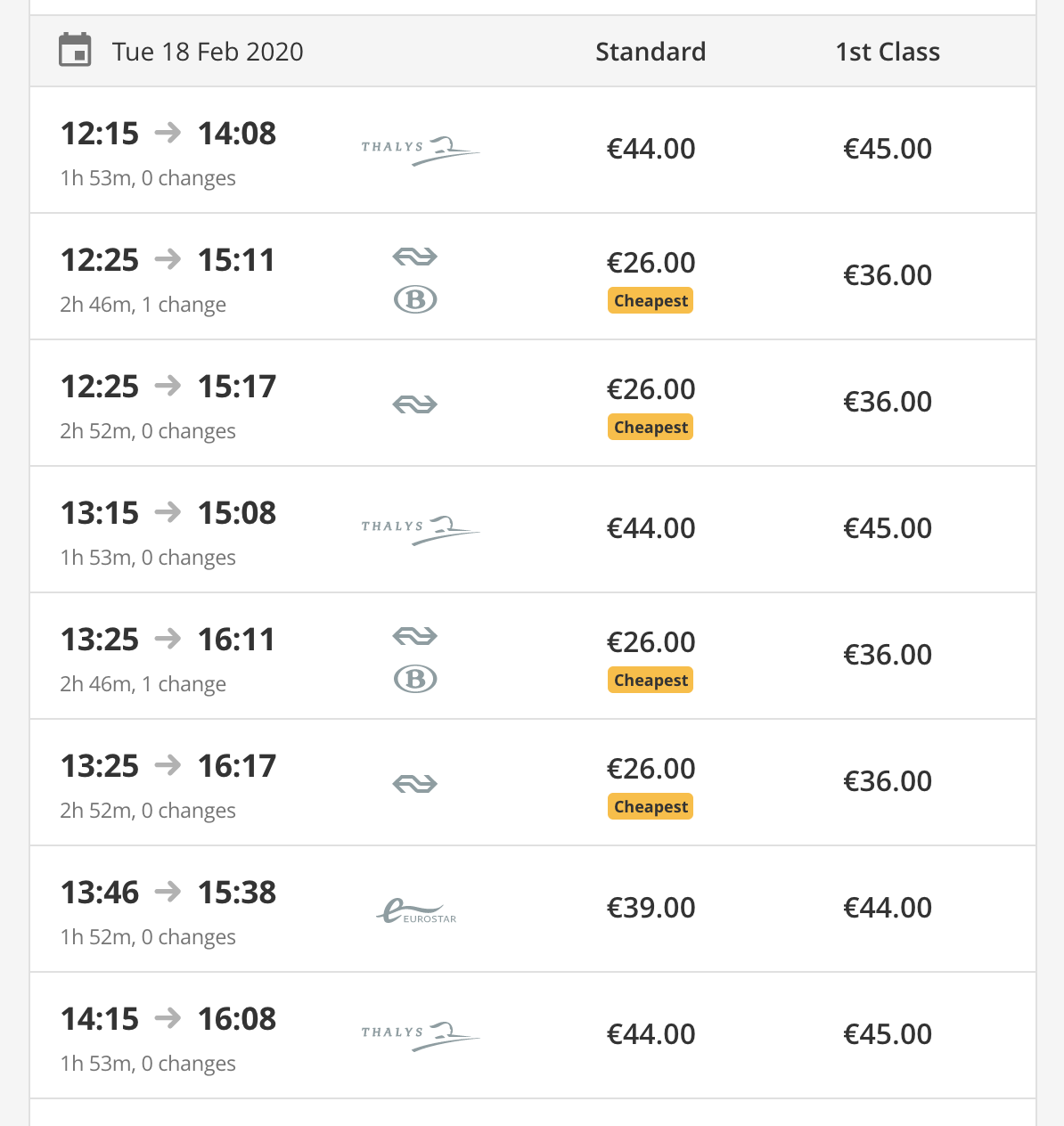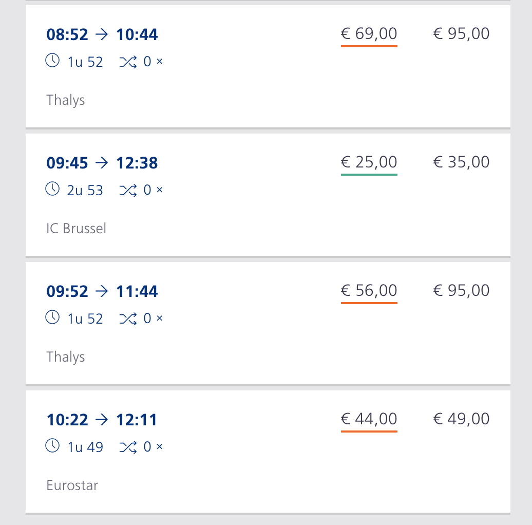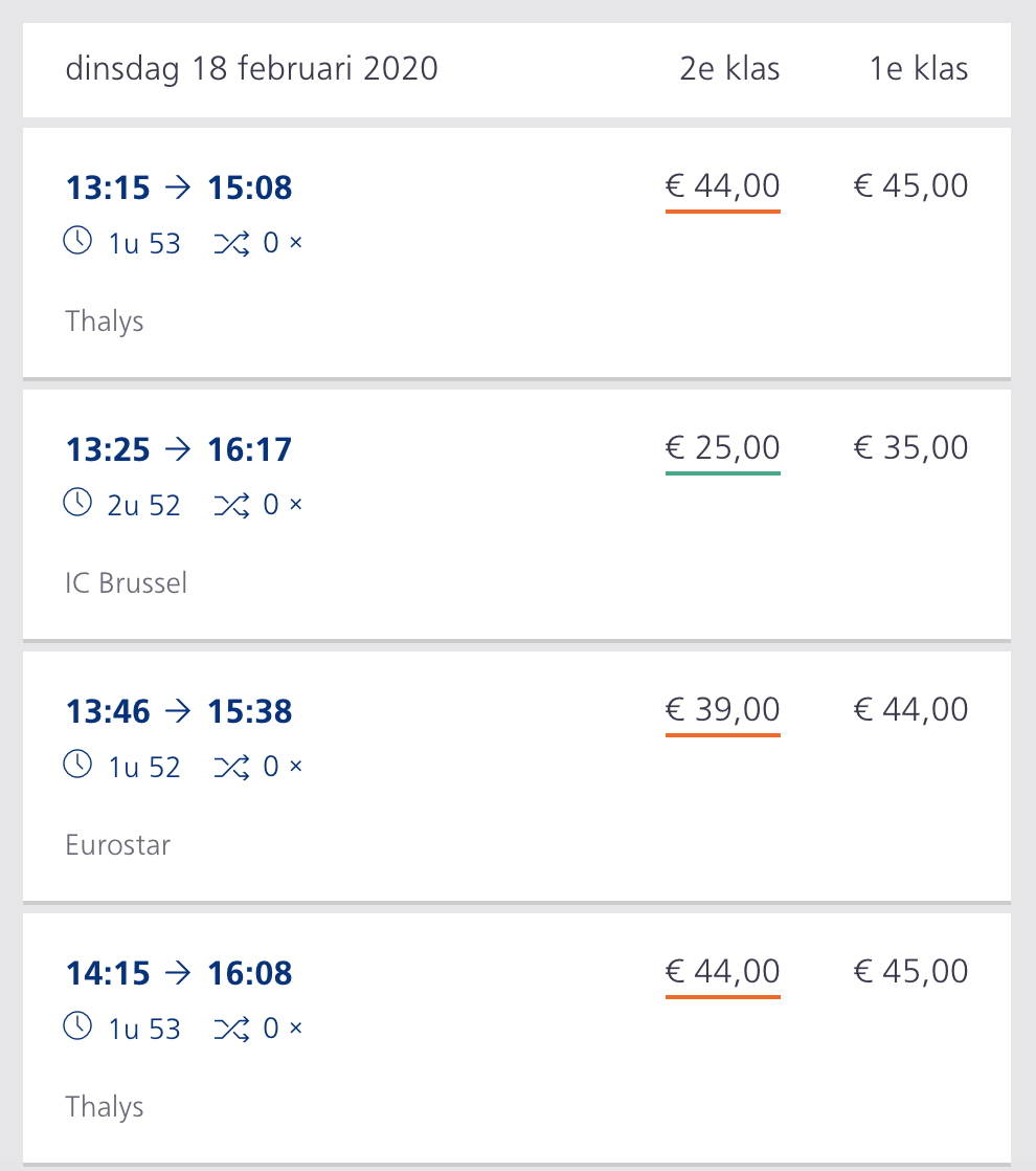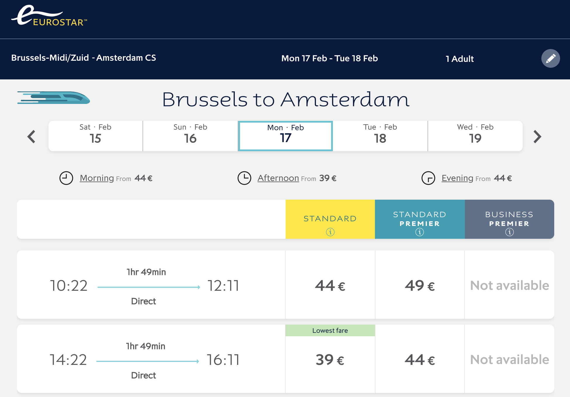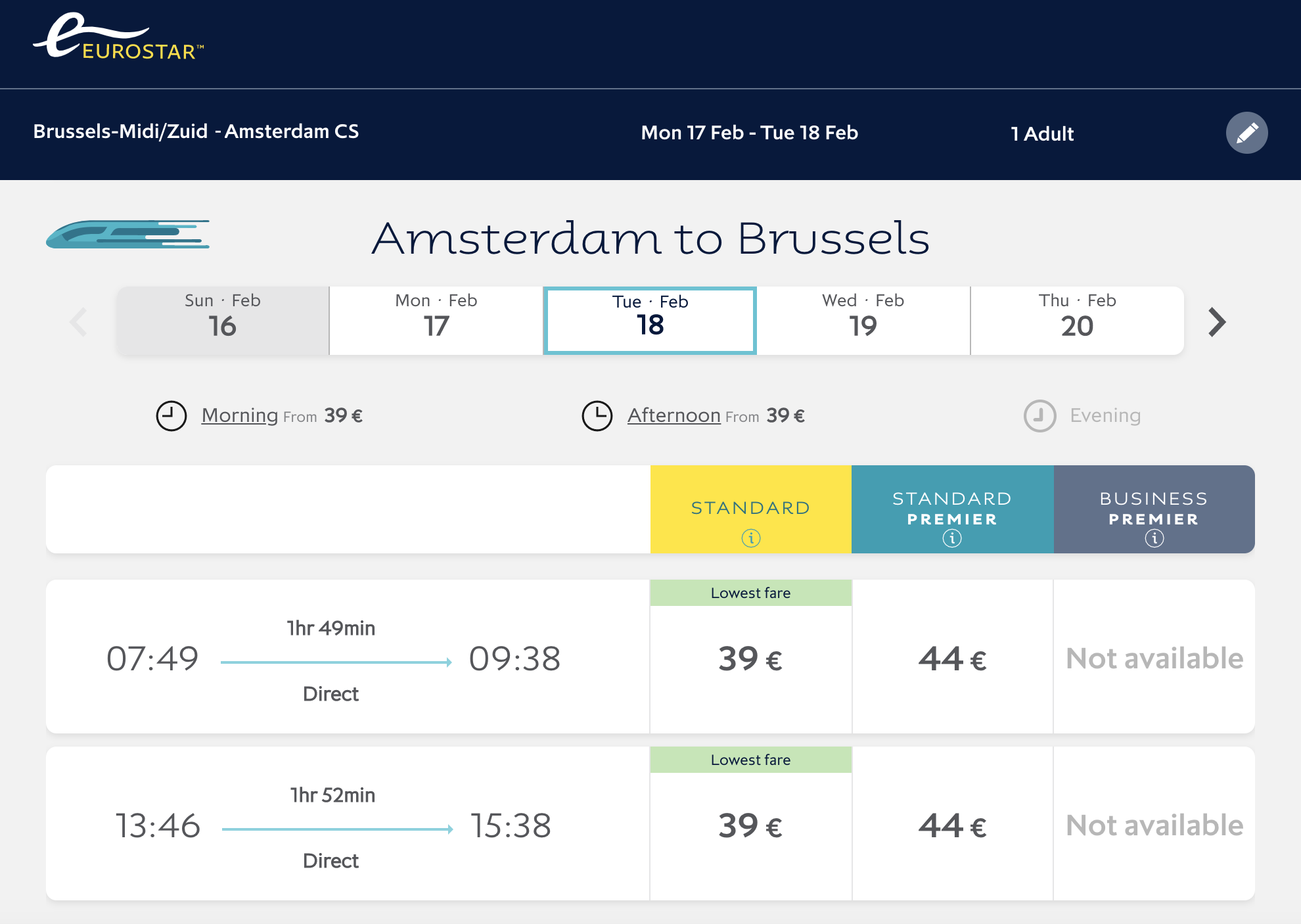 As a rail nerd I did of course know it exists but I have not had the chance to take it yet. But that gave me the idea for a little test - how easily could a regular traveller find tickets for Eurostar between Brussels and Amsterdam, and compare those with Thalys and the slower InterCity service that connects the two cities? On a weekday there are roughly 3 Eurostar services, 14 Thalys services, and 16 InterCity services - all direct - between the two cities.