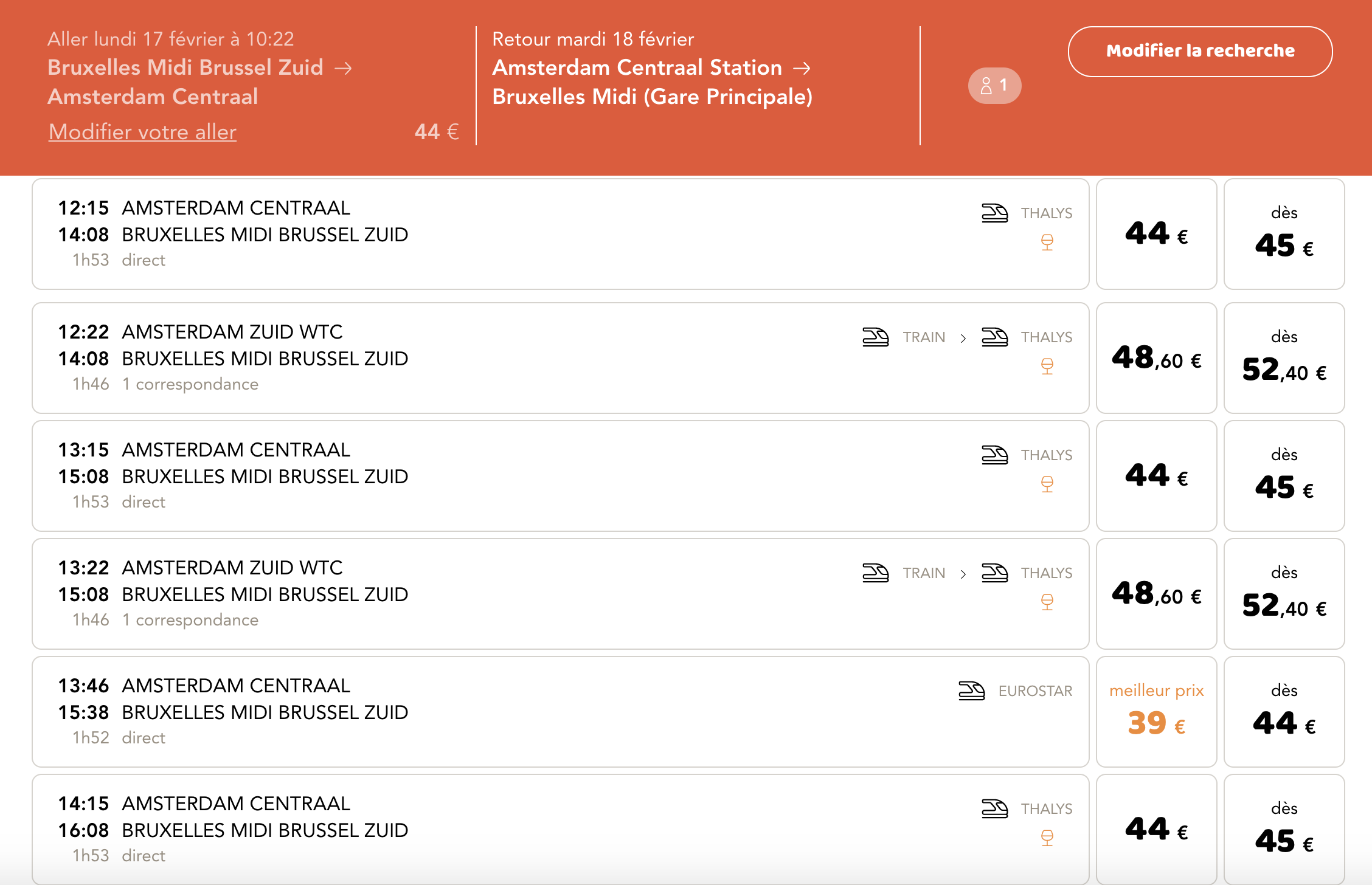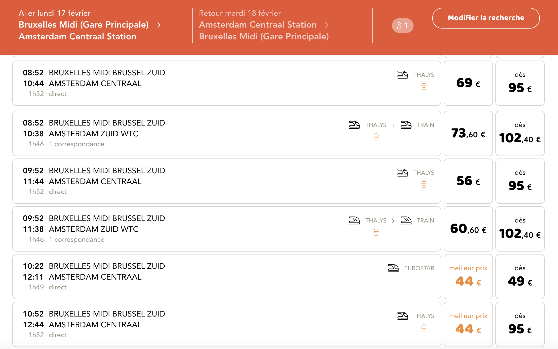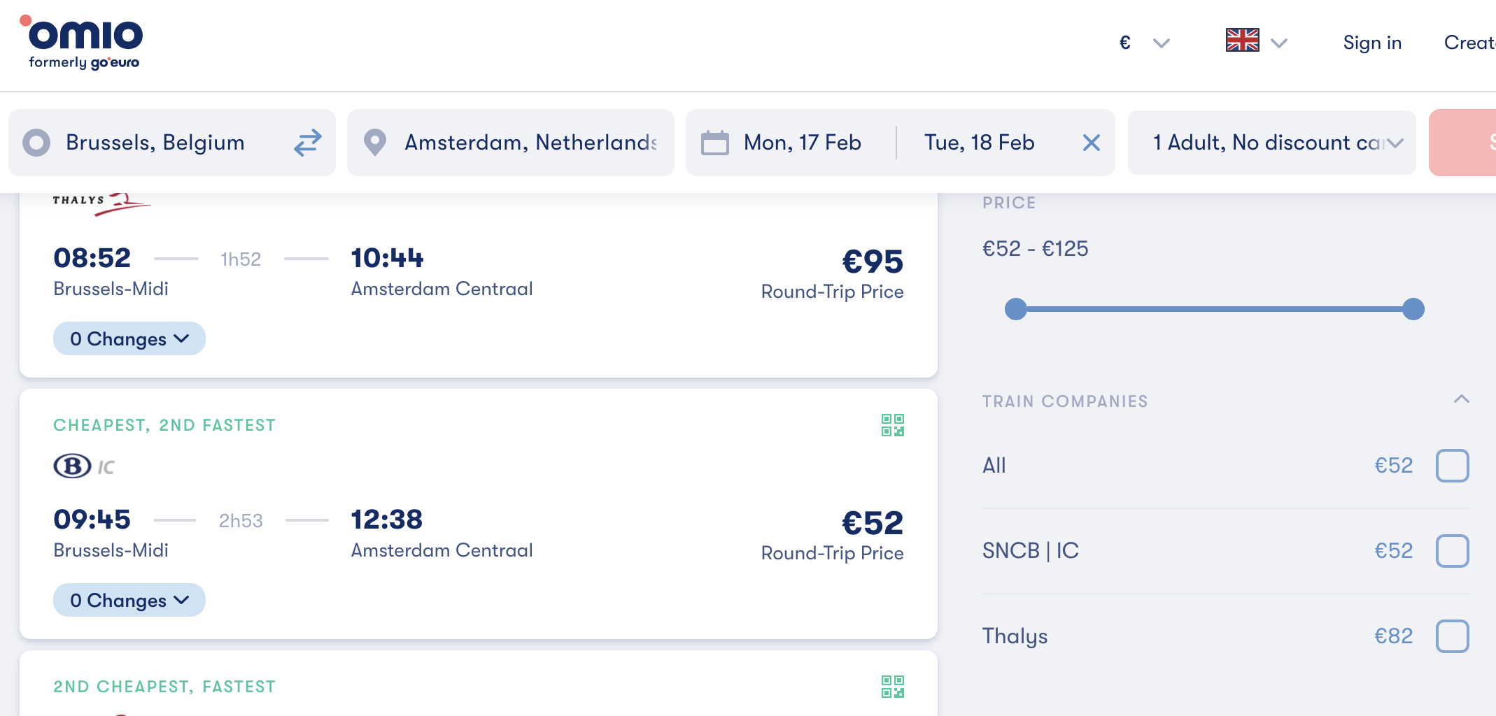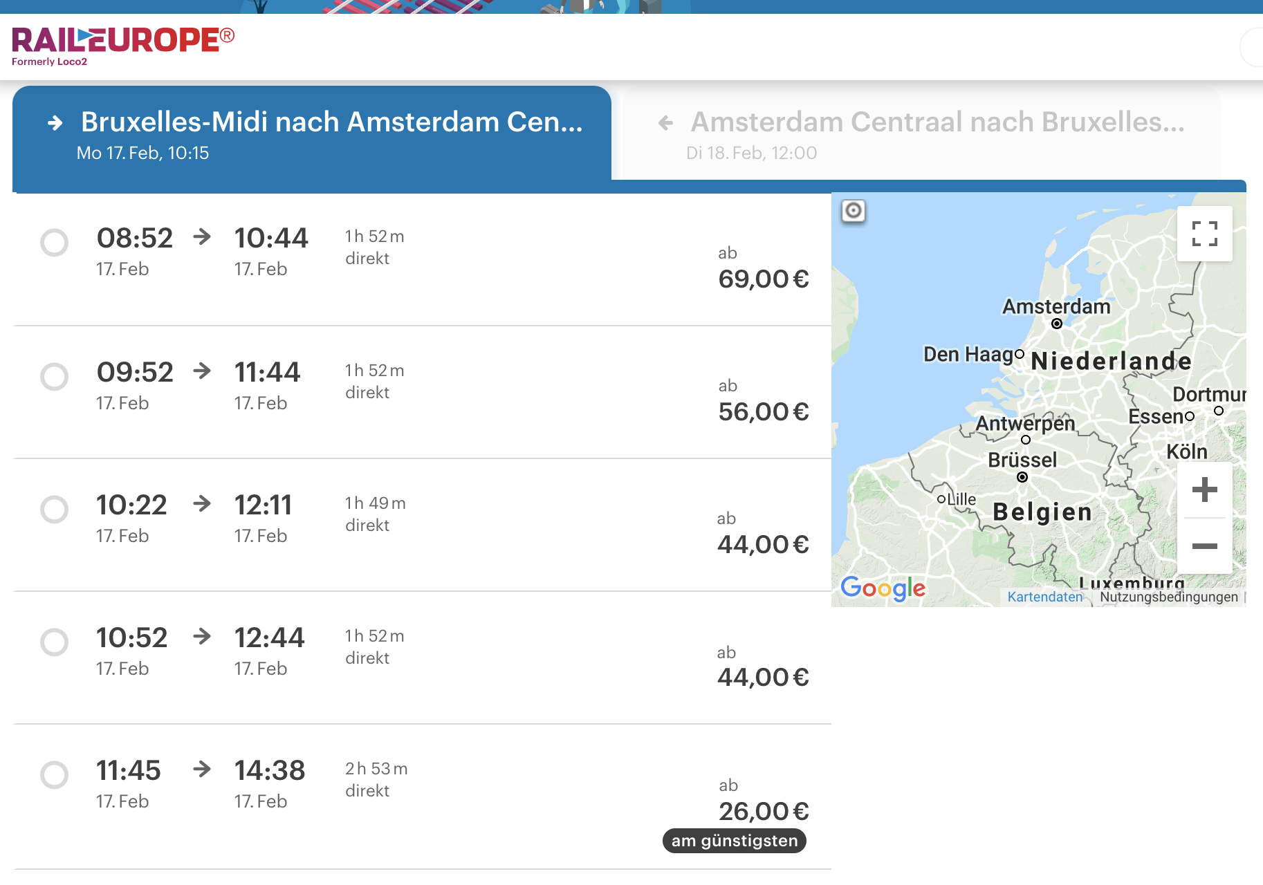 As a rail nerd I did of course know it exists but I have not had the chance to take it yet. But that gave me the idea for a little test - how easily could a regular traveller find tickets for Eurostar between Brussels and Amsterdam, and compare those with Thalys and the slower InterCity service that connects the two cities? On a weekday there are roughly 3 Eurostar services, 14 Thalys services, and 16 InterCity services - all direct - between the two cities.