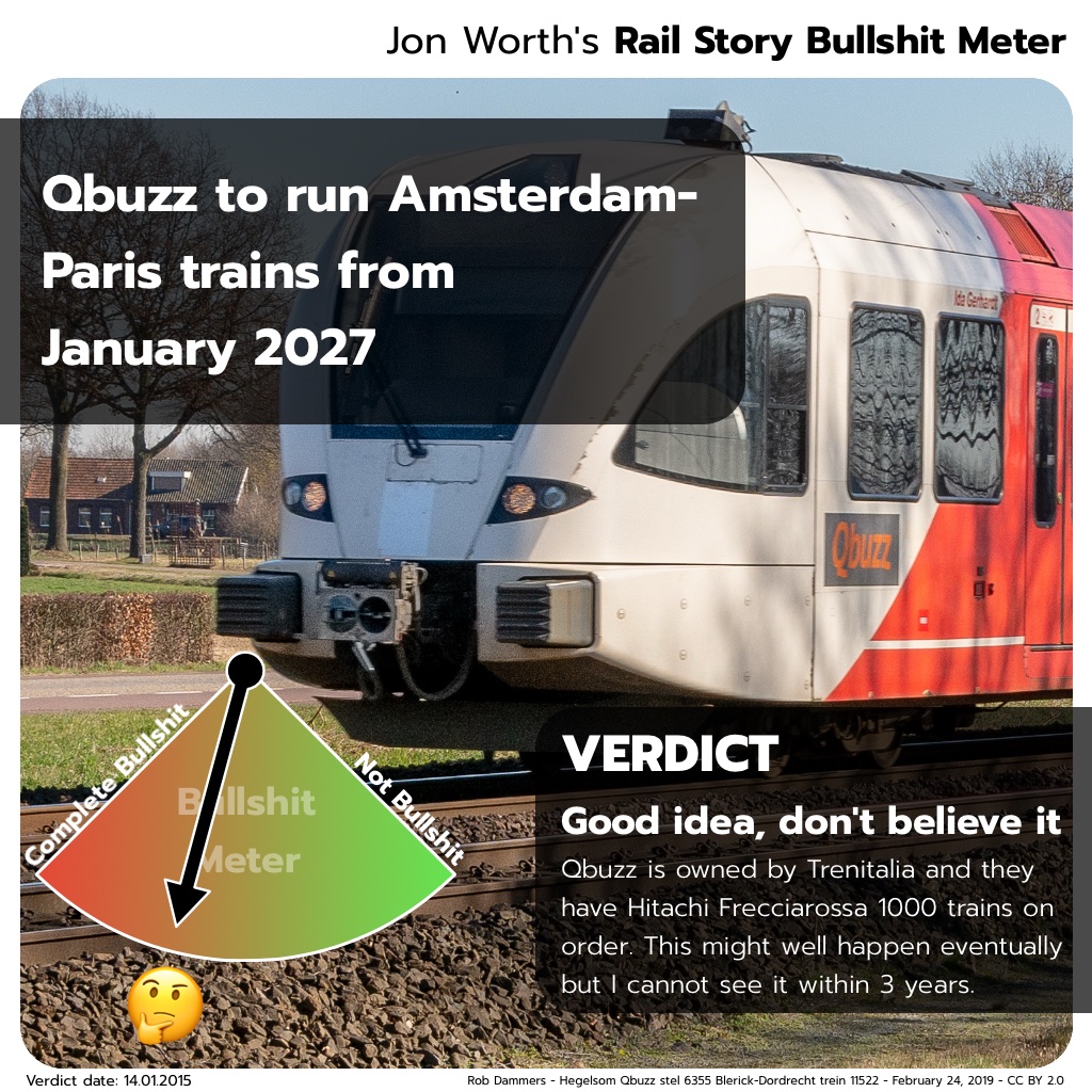 Here's the news story. This one is obvious at one level - Amsterdam-Paris is ripe for a rival. But trying to do this by January 2027 (so timetable change December 2026) looks like a hell of a long shot to me. But given Qbuzz is owned by Trenitalia, and Trenitalia is buying more Frecciarossa 1000 trains this could happen eventually.