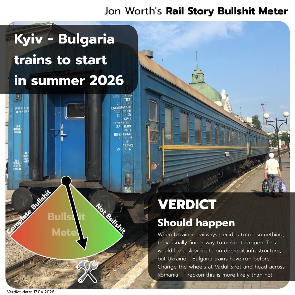 No one is under any illusions here - the train would have a trip time of about 30 hours to Varna, the same as a bus. But horribly slow trains operate from Ukraine to Moldova already for example. And some carriages where you can change the wheels (from 1520mm broad gauge to 1435mm standard gauge, at Vadul-Siret at the border to Romania) must be available somewhere, not least as the service used to exist in the 2010s. So I think this one is more likely than not to happen!