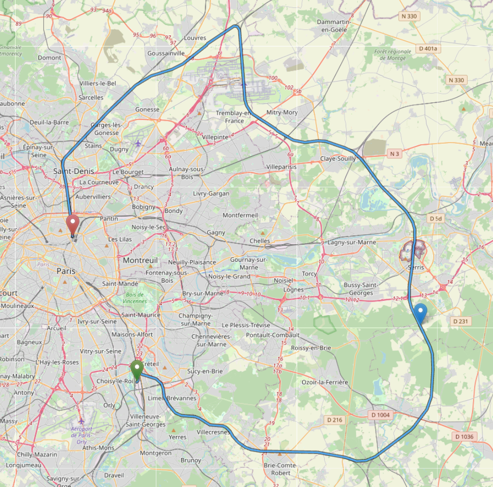 As Nicolai von Neudeck points out on Bluesky, yes there is another option - 40km, but requiring the train to reverse at Drancy, like this: