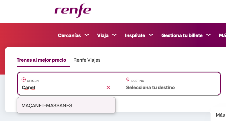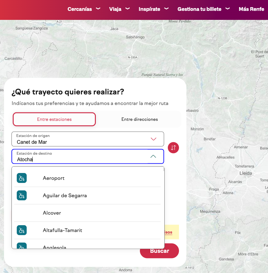 I can find Canet de Mar if I dig into the website deeper, on the dedicated Cercanias page. But then there there's no Madrid Atocha: