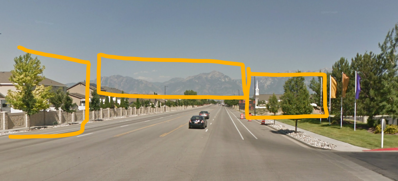 Lots to unpack here. A kind of housing estate on the left, mountains in the distance. And a church, but a modern one. Suburban road.