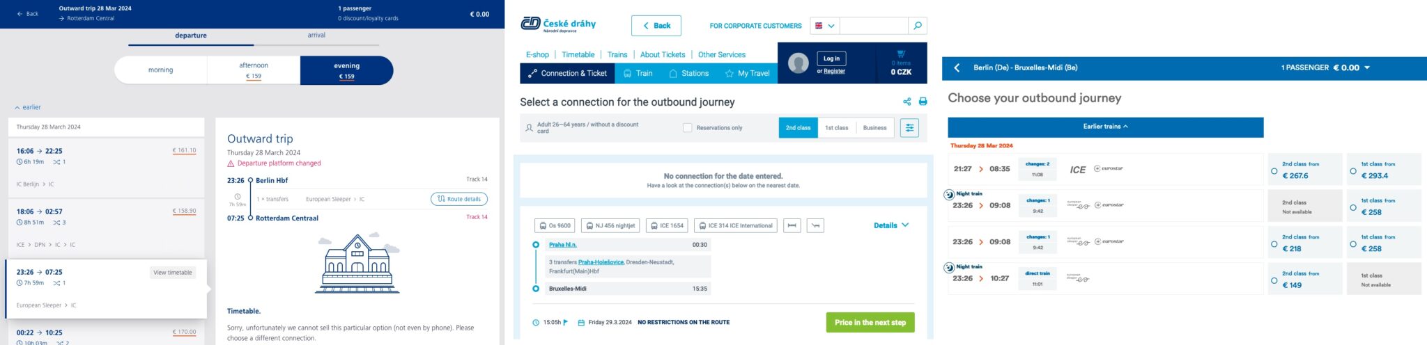 This screenshot shows the situation on bahn.de - European Sleeper times are shown, while with a click-through it is possible to get prices for the Nightjet night train that DB runs in cooperation with ÖBB, shown second here: