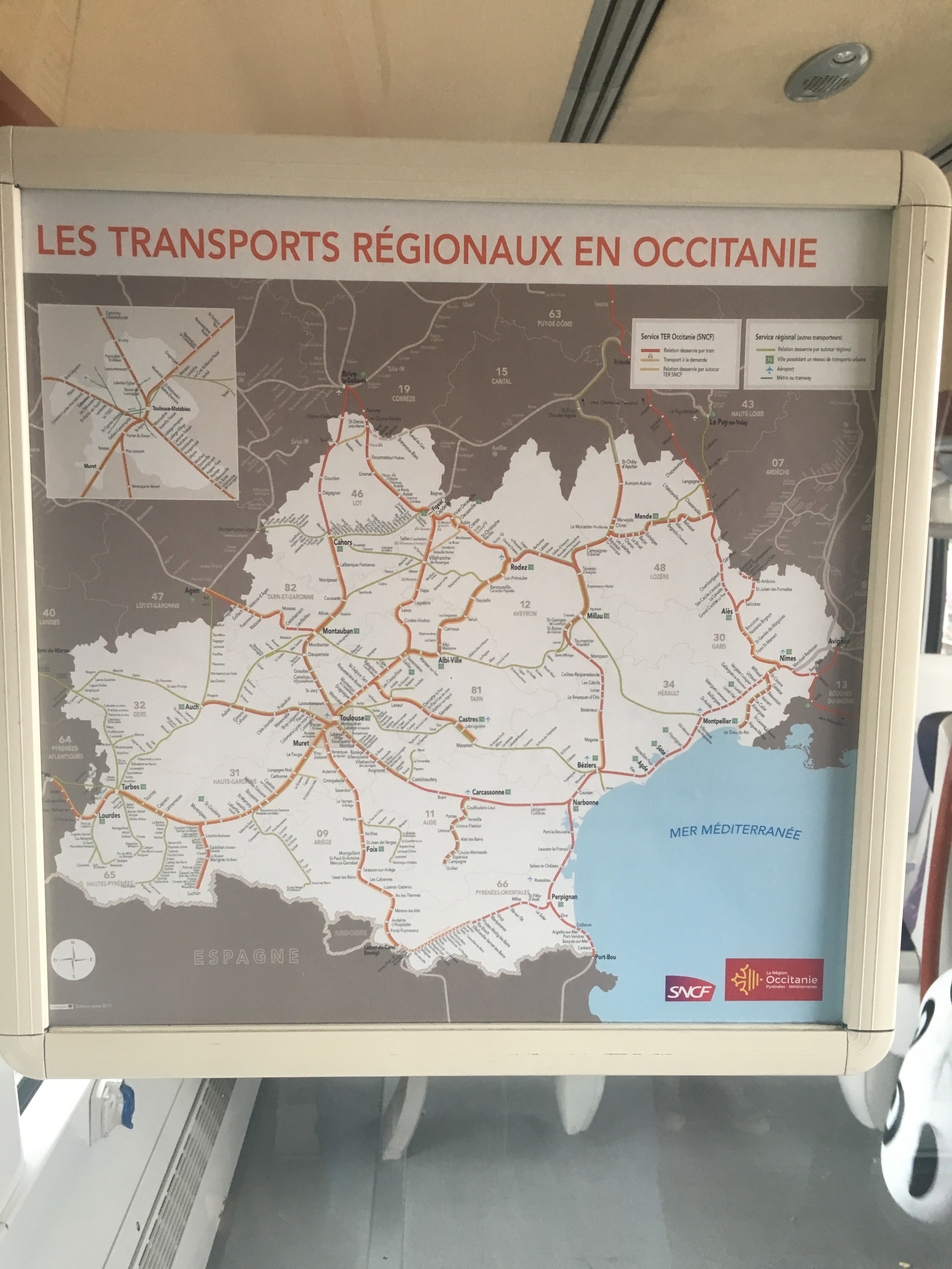 My trip today, 10 April 2018: Toulouse (population: 467000, 1.3 million in the urban area) to Béziers (population: 75000). Distance 176km by train, 180km by road. Departure time: sometime around 1500. Towns along the route: Castelnaudary (population: 11000), Carcassonne (48000), Narbonne (53000). Beyond Béziers are Montpellier, Nîmes and Marseille.