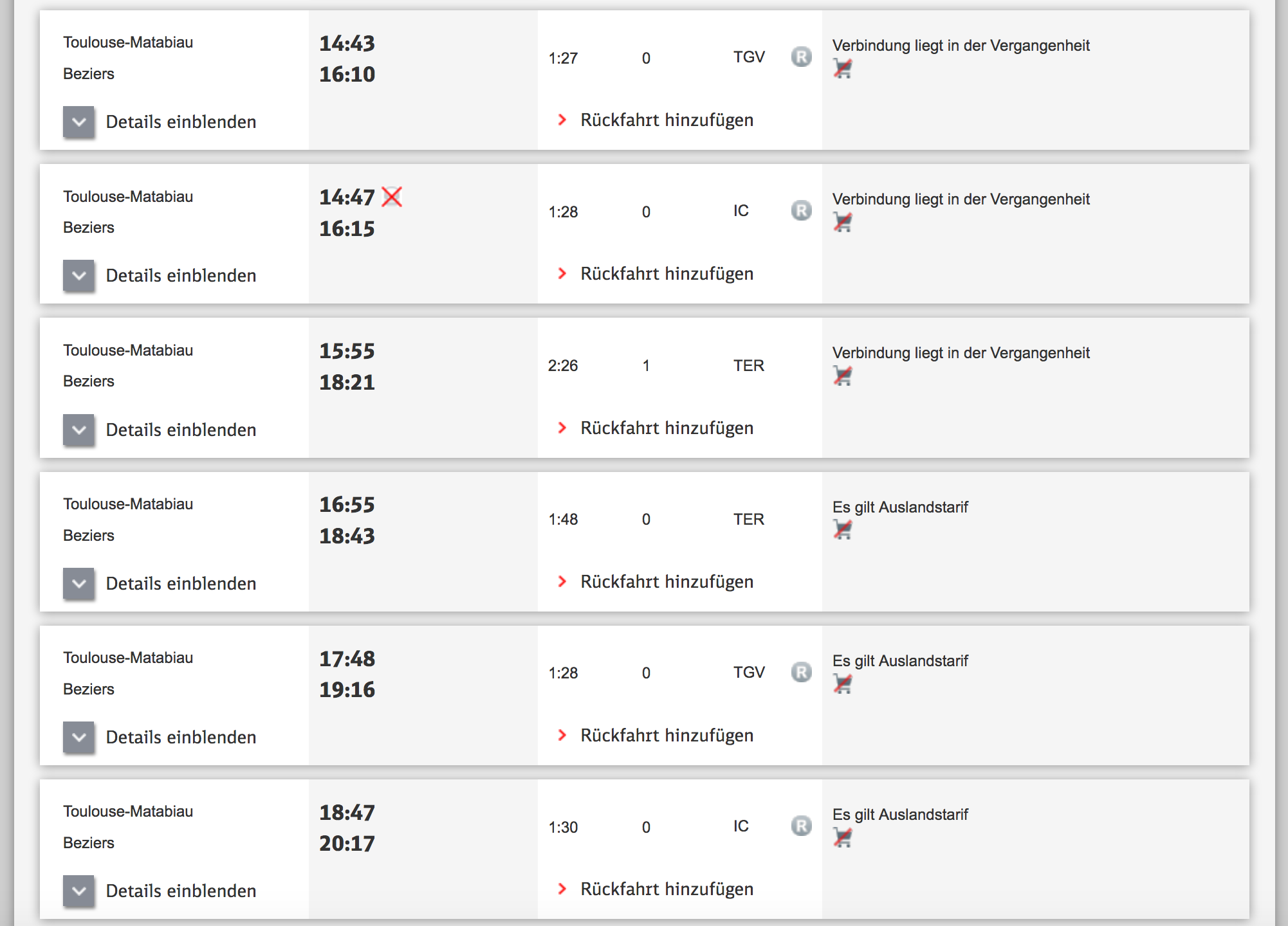 So then, how was my trip? The tracks at Toulouse Matabiau looked like they needed some attention for a start! I then took the 1555 TER train, changing in Narbonne. A single ticket cost me €29.10. The trains were bumpy Bombardier units that had seen better days and could do with a good clean. No wifi, but at least a power plug. The staff checking tickets (why three of them in a 3-car TER? - that productivity again) were friendly. And it got me there. The InterCités behind me meanwhile has a delay of 120 minutes...