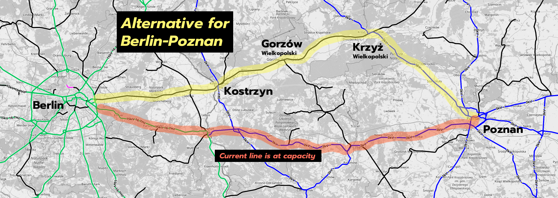 But when you view it this way, the Ostbahn - and its extension as far as Krzyż Wielkopolski - offers a secondary route to Poznan. Routing some freight this way, and indeed passenger trains as well if the line through Frankfurt (Oder) is closed for works, would make a lot of sense (click to enlarge):