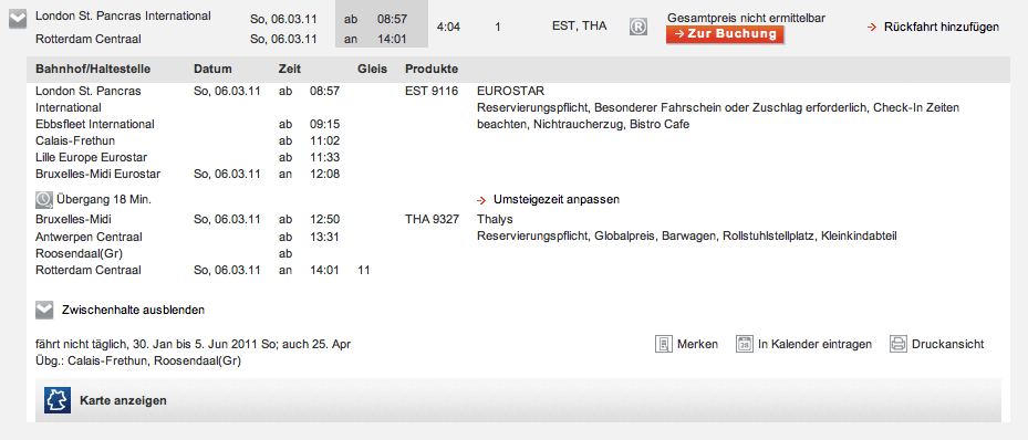 FIRST, get all the timetable information from German railways - reiseauskunft.bahn.de. Screenshots: London-Rotterdam, Rotterdam-London