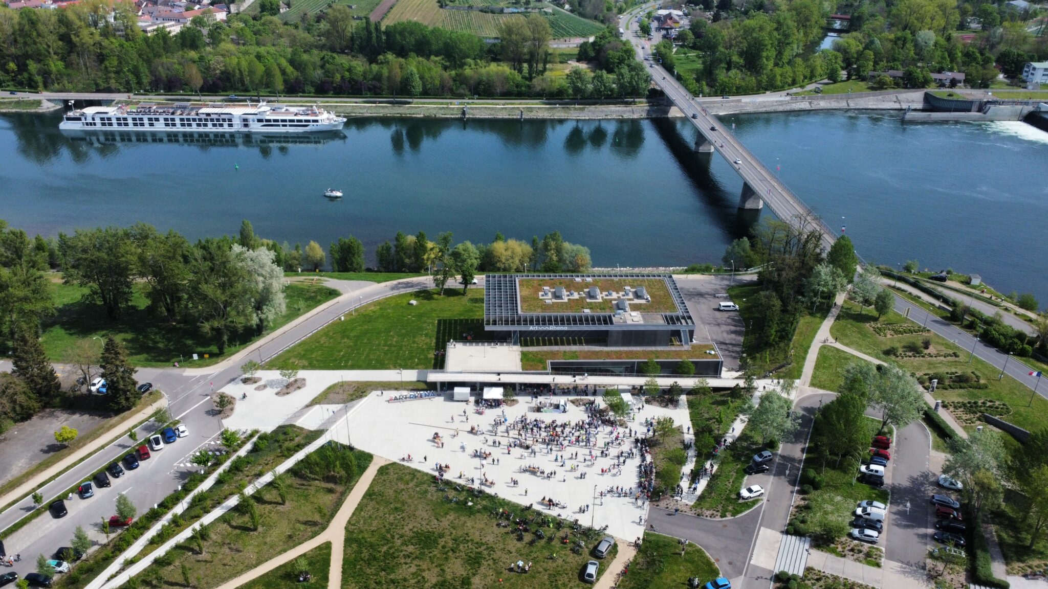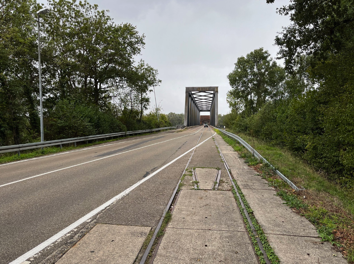 Ah, the famous one. Subject of studies and political speeches stretching back more than a decade. The bridge between Breisach and Volgelsheim was destroyed in World War II and a road bridge was built in its place. I was most recently at a protest in April 2024 for the re-opening of this one - you can see the people gathered at the event in this drone picture, and the road bridge is to the top right of the image: