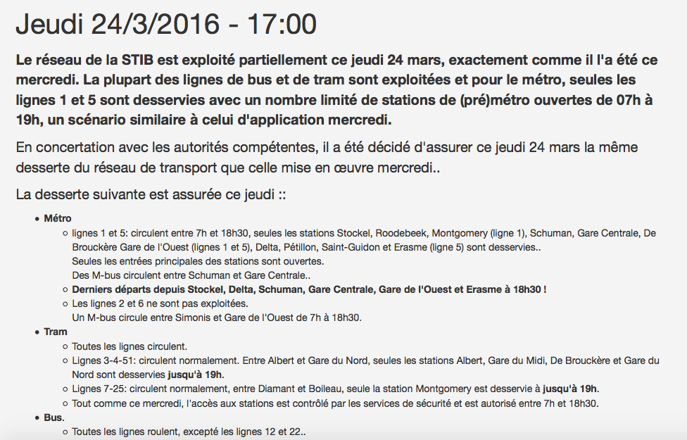 I’m in Brussels today (Thursday 24.3.2016), two days after the Brussels attacks at Zaventem and Maelbeek. STIB, the Brussels public transport network (operator of buses, trams and metro) is operating a limited service today for security reasons. A screenshot explaining the situation is here.