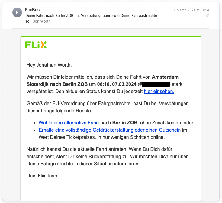 But then Martin Hoffmann gave me an idea in this toot. EU Regulation 181/2011 states “Where a carrier reasonably expects a regular service to be cancelled or delayed in departure from a terminal for more than 120 minutes” a passenger has a right to a refund. And then, going back over all the emails from Flixbus, I found this one sent at 01:24 on the morning of departure: