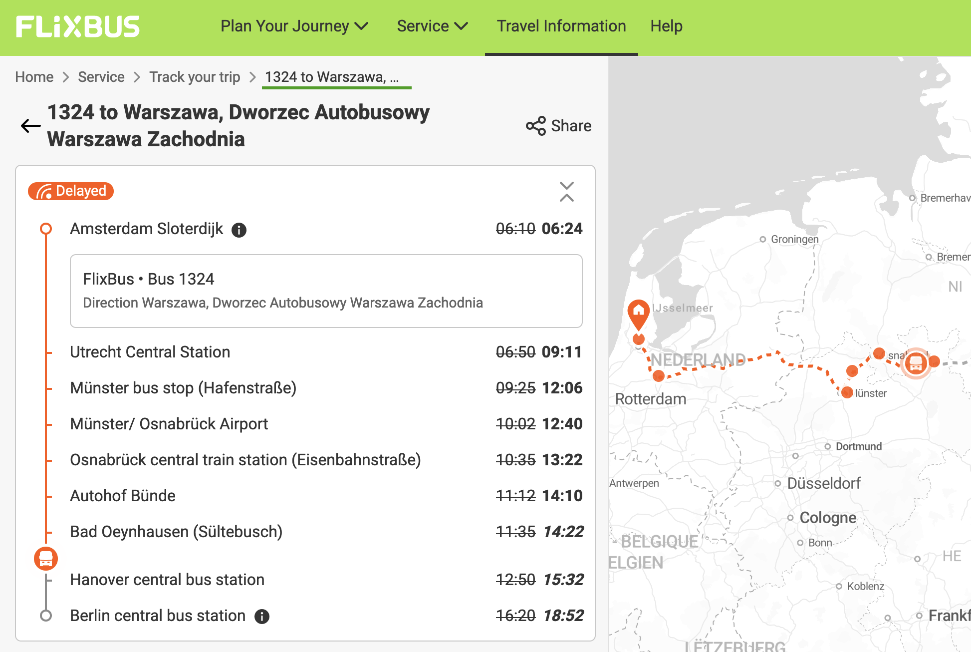 OK, I thought, I'll doze an hour more, and get to Sloterdijk an hour before the delayed departure - at about 07:10. Only then at 06:30 I checked the live tracking for the service... and discovered the bus had departed at 06:24 - without me on it.
