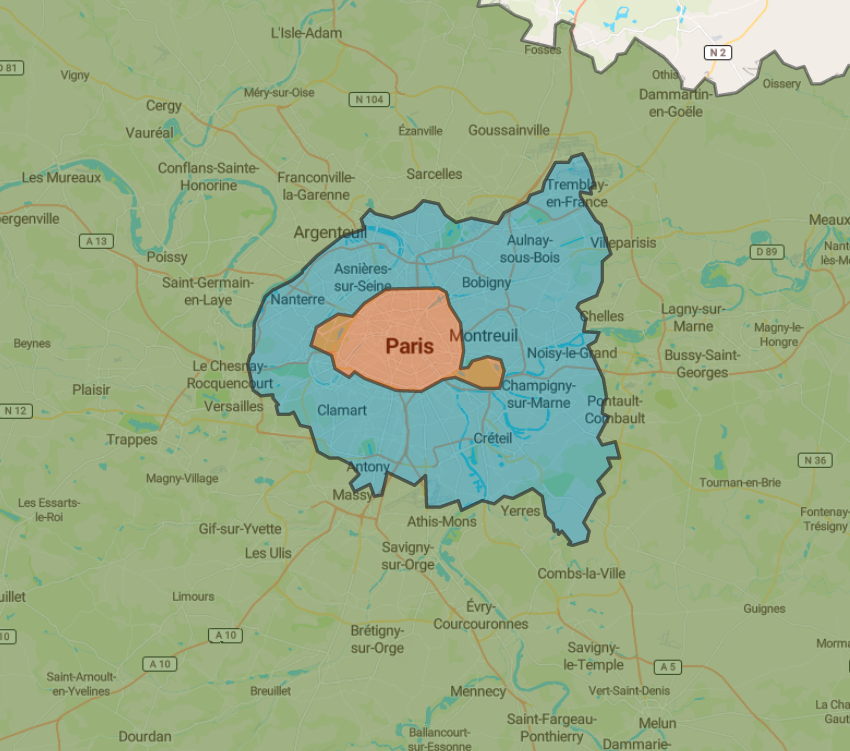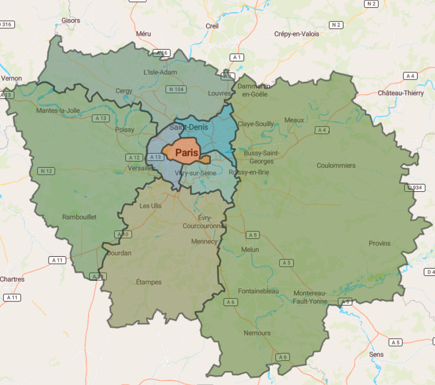 This map roughly shows the inner city (orange), the outer city (blue) and the suburbs (green) of Paris. It uses amalgams of départements to form the borders.