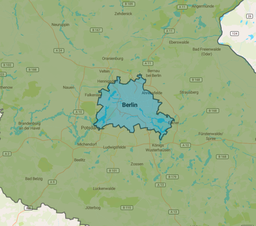 Now let's do this for Berlin. Blue is the Land of Berlin, and Green is the Land of Brandenburg. There is no orange. Yes, Berlin has its Bezirke, but they are too weak to decide parking or cycling policy on their own - they need the OK of the Land.